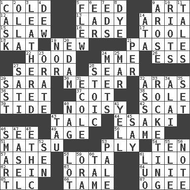 ACROSS 1. Chilled 5. Nourish 9. Tate display 12. Toward shelter 13. Kenny Rogers chart-topper in '80 14. Roberta Peters solo 15. Cole _ (cabbage dish) 16. Celtic language 17. Instrument 18. Krazy ___ of comics 19. ___ Haven, CT 21. Thick mixture 22. Parka part 24. Madame (abbr.) 26. Double-curved letter 27. Father Junipero _ 28. Dry up 29. "Two Mules for Sister ____" 30. Distance measurement 32. Ancient river in northeast Turkey 36. Proofreading order 37. Small bed 38. Not divided or shared with others 39. Periodic rise and fall of the sea level 40. Annoyingly loud 42. Go away! 43. Baby powder 44. 1973 Nobel Price Winner (Physics) Leo 46. Perceive with the eye 49. Personal question 50. Unable to walk 51. Taiwanese island in East China Sea 53. Travel a route regularly 54. "___ Little Indians" 57. American tennis player Robert 58. Globular water bottle used in Asia 61. _ and Stitch 62. It's straight from the horse's mouth 63. Relating to the mouth 64. A single undivided whole 65. Affectionate concern, for short 66. Docile 67. Double curve, resembling the letter S DOWN 1. Keg 2. Water jar 3. Tough but pliablecoriaceous 4. Morning condensation 5. Soared 6. Hearing organ 7. Begley and Asner 8. Color 9. Came up 10. Disturbances 11. Lies 14. _ moment's notice (2 wds.) 19. Not either 20. Dutch treat 21. For each 23. Declaim 24. Confronts 25. Impair 27. Suttee (variant) 28. Unemotional 29. Fast jet (abbr.) 31. Learning spot: Fr. 32. Indian state 33. Shooting up abruptly 34. Mountain range southwest of Kyrgyzstan 35. Put into a specified state 40. Tired old horse 41. Shout 43. The 19th letter of the Greek alphabet 45. Declare 46. Don Adams' spy role 47. Artist's stand 48. Moral principle 52. Elected rep. 53. Light colored 55. Writer Wiesel 56. Make mention of 58. Car dealer's back yard 59. Mouth or opening 60. Scottish cap 61. Nilotic language