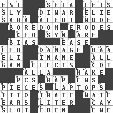 ACROSS 1. Eastern Standard Time (abbr.) 4. Bristle 8. Allows 12. Cunning 13. Middle Eastern gold or silver currency 14. Writer Wiesel 15. "Two Mules for Sister ____" 17. Eskimo relative 18. Unadorned 19. Mood resulting from idleness 21. Eats (away) 23. Corporate head (abbr.) 24. Symbol (abbr.) 26. "We ___ not amused" (Victoria) 27. Prejudice 28. Relaxation 30. Directed 31. Break 34. Sound made by sheep 37. Connecticut Ivy Leaguer 38. Empty; void 39. Everything 40. Separate the seeds from cotton 41. Chooses 42. Small bed 43. Silent film actress Nazimova 44. Create 46. Personal Computers (abbr.) 47. Strike 50. Followers of ems 51. Parts 54. Portable computers 57. "Tell ____ the Marines!" 58. Feeling or showing extreme anger 60. Nathan's nickname 62. Hearing organs 63. 61 cubic inches 64. Island 65. Slit 66. Paradise 67. Compass dir. DOWN 1. Curvy letter 2. Thick slice 3. Polypeptide antibiotic 4. Grain storage towers 5. Foe 6. The 19th letter of the Greek alphabet 7. Johnson of "Laugh-In" 8. Poe poem 9. Dodge 10. Periodic rise and fall of the sea level 11. Observes 13. Male parent 16. Type of rug 20. Greek goddess of the dawn 22. Raze (variant) 25. Intended 27. Actor Lugosi 29. Eons 30. Part of a journey 31. Deli pickle 32. Approach 33. Apple computer (short form) 34. Keyboard key 35. Medicinal plant 36. Keyboard modifier key 41. Otherwise 43. Buttonhole 44. Was introduced to 45. Soon (poet.) 46. Stone: prefix 48. Having winglike extensions 49. Eucharist need 51. Sliced desserts 52. Slanted text style (abbr.) 53. Drop; flow; fall 55. For each 56. Comedian Laurel of Laurel & Hardy 59. To free from 61. Sight organ
