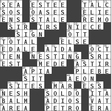 ACROSS 1. Ocean 4. First name in cosmetics 9. Baby powder 13. Mayday 14. Fertile tracts in a desert 15. Writer Wiesel 16. Followers of ems 17. Showing deterioration from age 18. San ____ (Riviera town) 19. Title for a knight 21. Big collection agency 22. Sibling's daughter 24. Signal 26. Baseball player Mel 27. "_____ Recall" 29. Otherwise 30. Peak District village in England 31. Opera by Verdi 33. Sep. follower 36. Nine, plus one 37. Nestling 40. Indian title of respect (Mr.) 41. Eastern Standard Time (abbr.) 42. Ancient Persian 43. Being in motion 45. Capital of Western Samoa 47. First-year military academy student 48. Be seated 49. Period of immesurable duration 50. Settings 52. Third mo. 54. Double-curved letter 56. Delicate 57. Twentieth part of a lira 59. Call ___ day 61. Lip ointment 62. Goodbye (Sp.) 63. Large container 64. Length times width 65. Stone: prefix 66. Epoch DOWN 1. Compass dir. 2. Immeasurably long periods of time 3. Aide 4. Greek goddess of the dawn 5. Smooth fabric 6. Russian ruler of old 7. Snakelike fish 8. Compass dir. 9. Cylindrical with tapered ends 10. Actor Baldwin 11. Welles in "The Third Man" 12. Corporate head (abbr.) 20. Monetary unit of Yemen 22. Pitcher Ryan 23. ___ a Wonderful Life 25. Small, secluded valley 27. False hair 28. Lyric poems 29. Singer Brickell 31. At sea 32. It would 33. Clearly or manifestly demonstrative 34. Baby bed with high sides 35. Become fatigued 38. Gives off 39. Open wide 44. A type of plum 45. Respiratory problem 46. Sliced dessert 49. Zeal 50. Wither 51. Capri or Wright 52. Method 53. Came down and settled, as after flight 55. Play the lead 56. Basketball assoc. 57. Plant excrement 58. Bear (Spanish) 60. _ moment's notice (2 wds.)