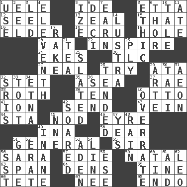 ACROSS 1. Ubangi River tributary 5. Binary compound 8. Singer James 12. Sew up the eyelids of hawks and falcons 13. Ardor 15. Not this but _ 16. A person who is older than you are 18. Shade of tan 19. Opening into or through something 20. Large container 22. Stimulate to action 24. Makes supply last 26. Affectionate concern, for short 27. Actress Patricia 28. Attempt to accomplish something 29. "One Day ___ Time" 32. Proofreading order 35. At sea 37. Actress Charlotte 38. Writer of Portnoy's Complaint (1969) 39. Nine, plus one 40. Von Bismarck 41. Electrically charged atom 42. Post 43. Distinctive style or manner 44. R.R. building 45. Allow head to fall sleepily 46. Jane of fiction 49. _ tizzy (2 wds.) 50. Letter starter 51. Commissioned military rank 55. Title for a knight 56. "Two Mules for Sister ____" 57. Singer Brickell 59. Relating to or accompanying birth 63. Connect, as a bridge 64. Habitations of wild animals 65. Prong on a fork 66. False hair 67. Born 68. Inside; within (prefix) DOWN 1. Purpose 2. Snakelike fish 3. Directed 4. Veterans Day date 5. Ending with capital 6. Tenth: prefix 7. Merit 8. Moral principle 9. Son of Odin 10. Lie 11. Had dinner 14. A period of five years 17. Libertine 21. Afternoon social gathering 23. Apply oneself diligently 25. Scheduled 28. Watched over 29. Johnson of "Laugh-In" 30. Jacques of French films 31. Age 32. Indian titles of respect 33. A blast of a horn 34. Inactive volcano in Sicily 36. Elected rep. 40. Make much ado about nothing 42. Flew 45. Compass dir. 47. Consenting reply 48. Precipitation 49. Empty; void 51. Open wide 52. Part of Q.E.F. 53. An important port of Yemen 54. Actor's bit 56. Fast jet (abbr.) 58. Compass dir. 60. Shallow baking pan 61. Also 62. Lion