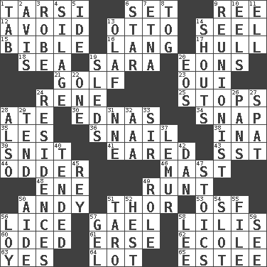 ACROSS 1. Tarsus (plural) 6. Put into a specified state 9. To riddle 12. Shun 13. "Beetle Bailey" pooch 14. Stitch closed the eyes of (a falcon) 15. The Good Book 16. Austrian-born American filmmaker Fritz 17. Frame or body of a ship 18. Ocean 19. "Two Mules for Sister ____" 20. Immeasurably long periods of time 21. Eighteen holes 23. Fr. "Yes" 24. French philosopher Descartes 25. Ceases 28. Had dinner 30. Ferber et al. 34. Fastener 35. French article 36. Slow-paced one 38. _ tizzy (2 wds.) 39. In a ____ (agitated or irritated) 41. Having ears or earlike features 43. Fast jet (abbr.) 44. More peculiar 46. Vertical spar for supporting sails 48. Compass dir. 49. The smallest animal of a litter 50. Actor Griffith 51. Son of Odin 53. Order of Saint Francis (abbr.) 56. Louse (plural) 57. Highlander 58. Ms. Damita and namesakes 60. Wrote a lyric poem 61. Celtic language 62. Learning spot: Fr. 63. It is so 64. Car dealer's back yard 65. First name in cosmetics DOWN 1. Bar bill 2. Advice 3. Loose flowing garment 4. Fodder prepared in a silo 5. Binary compound 6. Play the lead 7. Inactive volcano in Sicily 8. Coat; cloak 9. One who advocates reunion 10. Snakelike fish 11. Pipe bend 13. Norwegian king 14. Yells 19. Bobsleighs 20. Greek goddess of the dawn 22. Single 24. Dwellings 26. Baking dishes 27. Petty quarrel 28. In addition 29. Be inclined (to) 31. Compass dir. 32. Auto club (abbr.) 33. Title for a knight 37. Arboreal primate 40. Looked after 42. Daniel's nick name 45. Marina Del _, California 47. Unemotional ones 49. Hero or heavy, e.g. 50. Helper 51. Pacific island yam 52. Command 54. Narrow, elongated depression 55. Do some clerical work 56. Myrna of the movies 57. Set 58. Area sheltered from the wind 59. Perceive with the eye