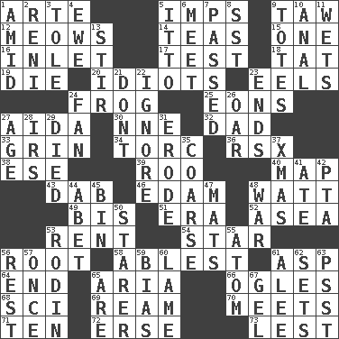ACROSS 1. Johnson of "Laugh-In" 5. Naughty children 9. The 23rd letter of the Hebrew alphabet 12. Catcalls? 14. Afternoon social gatherings 15. Single 16. An arm off of a larger body of water 17. Trial 18. Make lace 19. Expire 20. Foolish or stupid persons 23. Snakelike fish 24. Tree-dwelling hopper 25. Immeasurably long periods of time 27. Opera by Verdi 30. Compass dir. 32. June honoree 33. Amused look 34. Torque (variant) 36. Acura sports coupe 38. Compass dir. 39. Friend of Pooh 40. Atlas unit 43. Pat or tap gently 46. Dutch treat 48. Electrical Unit 49. Twice 51. Period 52. At sea 53. Monthly bill 54. Play the lead 56. Carrot, for example 58. Most capable 61. Viper 64. Conclusion 65. Roberta Peters solo 66. Stares at amorously 68. _-fi 69. 480, 500 or 516 sheets of paper 70. Confronts 71. Nine, plus one 72. Celtic language 73. For fear that DOWN 1. Among 2. Painter Guido (1575-1642) 3. Lacquered or enameled metalware 4. She-sheep 5. "Tell ____ the Marines!" 6. Confront 7. Went by 8. Fast jet (abbr.) 9. Hauls 10. Of or related to the anus 11. Soaks 13. Use a swizzle stick 21. Do not 22. Refuse to acknowledge 23. Extremities 24. Avid follower 26. Rowing implement 27. Ripen 28. Big collection agency 29. Passed on 31. Wear away 35. Unrefined 37. Dec. holiday 41. Had dinner 42. Parent Teacher Assoc. 44. Collude with 45. Storage container 47. Floor protectors 48. Armed conflict 50. A viewer who gazes fixedly 53. "The Thinker" sculptor 55. Smallest unit of an element 56. Take ten 57. Single time 59. Prejudice 60. Unable to walk 61. Toward shelter 62. Puts into a specified state 63. Inconspicuous attention getter 65. "We ___ not amused" (Victoria) 67. Set