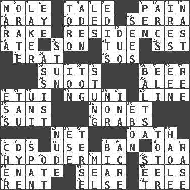 ACROSS 1. Undercover agent 5. Story 9. Ache 13. Like ___ of sunshine 14. Wrote a lyric poem 15. Spanish missionary in California 16. Libertine 17. Dwellings 19. Had dinner 20. Male child 21. Third day of the wk. 22. Fast jet (abbr.) 23. Part of Q.E.F. 25. Distress signal 26. Sets of matching outer garments 30. Fermented drink made from hops 34. Snout, nose 35. Toward shelter 36. Needle case 39. Group of southern Bantu languages 42. Actor's bit 43. Without 44. Music written for nine 46. Set or collection 47. Catches 48. Fish or hair follower 51. Pledge 54. Music discs 57. Purpose 58. Forbid 60. Boat paddle 62. Below the epidermis 65. Portico 66. Maternal 67. Shrivel 68. Snakelike fish 69. Monthly bill 70. Otherwise 71. Family _ (genealogy) DOWN 1. Hindu Mythology: god of death 2. Declaim 3. Member of a famous L.A. basketball team 4. Sight organ 5. "Corrida" creature 6. An important port of Yemen 7. French article 8. Proofreads 9. Fenced enclosure 10. Curves 11. Angers 12. Political cartoonist Thomas 15. Observes 18. Superhero pair 20. Astound 24. Aid 27. Electrically charged atom 28. Coat; cloak 29. Feeling sharp psychological pain 30. Greek mezzo-soprano Agnes 31. Biblical high priest 32. Car or cant ending 33. To riddle 36. Double-curved letter 37. The 19th letter of the Greek alphabet 38. Corn or form start 40. Not either 41. _ tizzy (2 wds.) 45. Inky black, to poets 48. Naked 49. Compass dir. 50. Laconic 52. Carrier 53. White Person, in Hawaii 54. "Mermaids" star 55. Centimeter-gram-second unit of force 56. Connect, as a bridge 58. Prejudice 59. Land measure 61. Raze (variant) 63. Baseball player Mel 64. Cartoonist voice _ Blanc 65. Put into a specified state
