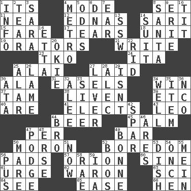 ACROSS 1. ___ a Wonderful Life 4. Method 8. Arrange properly for use 11. Teachers' org. 12. Ferber et al. 14. Indian skirt 15. Conductor's collection 17. Pulls into pieces 18. A single undivided whole 19. Speakers 21. Compose 23. Ring climax 24. Call ___ day 25. Mountain range southwest of Kyrgyzstan 27. Put down 30. Insect wing 31. Artist's stands 34. Acquire through effort 37. Scottish cap 38. Make or become more lively 39. And so on (abbr.) 40. "We ___ not amused" (Victoria) 41. Opts 43. Lion 44. Fermented drink made from hops 45. Inside of hand 47. For each 49. Tavern 50. Person of subnormal intelligence 52. Mood resulting from idleness 56. Writing tablets 57. Greek mythologigal hunter 60. Trig term 61. Goad 62. Make _____ (do battle with) 63. _-fi 64. Observe 65. Relaxation 66. Layer DOWN 1. A message received and understood 2. Pull into pieces 3. "Two Mules for Sister ____" 4. Paris' subway 5. Lyric poems 6. Heredity factor (abbr.) 7. Ewer handle 8. Before Barbara or Clara 9. One of the Great Lakes 10. Teat (slang) 13. Compass dir. 14. Set of matching outer garments 16. Singer James 20. Migrant worker of the '30s 22. To free from 25. Having or resembling wings 26. Unable to walk 27. Prying instrument 28. Actor Baldwin 29. Is not 30. "One Day ___ Time" 32. Toward shelter 33. Drop; flow; fall 34. Water source 35. A whole individual unit 36. Non-commissioned officer (abbr.) 42. Coast Guard woman 44. Sis' sibling 46. Ancient Greek god of war 47. Plash 48. Celtic language 49. Maid-servant 50. Female horse 51. At this time 52. Scornful sounds 53. Food container 54. Single time 55. Chow _ 56. Purulenc 58. Actress Charlotte 59. Retirement account (abbr.)