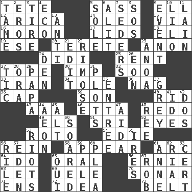 ACROSS 1. False hair 5. Backtalk 9. Pipe bend 12. N. Chile seaport 14. Margarine 15. By way of 16. Person of subnormal intelligence 17. Hats (slang) 18. Biblical high priest 19. Compass dir. 20. Cigar-shaped 23. At once, immediately (arch.) 24. "You Light Up My Life" star Conn 25. Monthly bill 27. Drink excessively 30. Naughty child 32. "Barney Miller" actor Jack 33. SW Asia republic 34. Lacquered or enameled metalware 36. Tired old horse 38. Head covering 39. Male offspring 40. To free from 43. Auto club (abbr.) 46. Singer James 48. Make new 49. Raised railways 51. _ Lanka 52. Sight organs 53. Printing process, for short 54. Singer Brickell 56. It's straight from the horse's mouth 58. Seem 61. Curve 64. Wedding promise 65. Taken by mouth 66. Bert's buddy 68. Allow 69. Ubangi River tributary 70. Underwater navigation system 71. Followers of ems 72. The content of cognition 73. Waist strap DOWN 1. Not wild 2. Greek god of love 3. Hoop that covers a wheel 4. Environmental prefix 5. Not divided or shared with others 6. Set down 7. Spring feasts 8. Mayday 9. Incident 10. _ and Stitch 11. (Had) reclined 13. Against 21. Prepare for publication 22. Full of chinks, cracks, or crevices 23. Small Philippine buffalo 24. Lair 26. A really long time 27. Nervous spasm 28. Mouth or opening 29. Dad 31. Schemes 35. Main course 37. Jennifer or Joel 41. Binary compound 42. Two (Sp.) 44. Period of immesurable duration 45. Keyboard modifier key 47. Opera by Verdi 48. To separate or throw off 50. Flew 53. Disturbances 55. Angers 56. Cause heat under the collar 57. Genesis locale 59. Light colored 60. Entreaty 61. Queen of England 1702-14 62. Monetary unit of Yemen 63. Foregone conclusion 65. Fr. "Yes" 67. Director Reiner