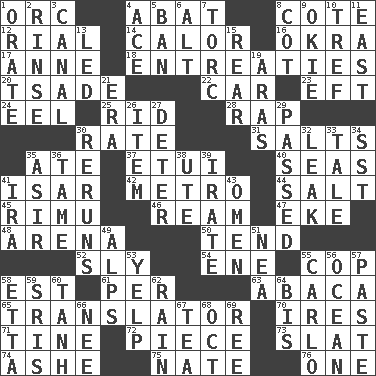 ACROSS 1. The grampus (Milton) 4. Blind as ____ 8. ____ d'Azur (French Riviera) 12. Monetary unit of Yemen 14. Bodily heat indicating an inflammation 16. Gumbo ingredient 17. Singer Murray 18. Pleas 20. Sadhe (variant) 22. Auto 23. Lizard (obsolete) 24. Snakelike fish 25. To free from 28. Strike 30. Assign a rank or rating to 31. Table seasonings 35. Had dinner 37. Needle holder 40. Oceans 41. Austrian river, tributary to the Danube 42. Paris' subway 44. Table seasoning 45. Tall New Zealand timber tree 46. 480, 500 or 516 sheets of paper 47. Supplement with great effort 48. Sports stadium 50. Watch over 52. Insidious 54. Compass dir. 55. Police officer (slang) 58. Eastern Standard Time (abbr.) 61. For each 63. Phillipine bananalike plant 65. Interpreter 70. Angers 71. Prong on a fork 72. Component 73. Narrow board 74. American tennis player Robert 75. Nathan's nickname 76. Single DOWN 1. Declaim 2. Wash lightly 3. Lessep's creation 4. Adept person 5. Bar 6. The first octave above the treble staff 7. Torque (variant) 8. Small bed 9. Migrant worker of the '30s 10. Unclean, religiously 11. Compass direction 13. Directed 15. Hitchcock's "____ Window" 19. Ancient river in northeast Turkey 21. Epoch 26. Detail 27. Prevent from occurring 29. Went by 30. Summer TV shows 32. Path through which fluid escapes 33. Lie 34. Fast jet (abbr.) 35. SW Saudi Arabia district 36. Not wild 38. Shoshoni 39. Feeling or showing extreme anger 41. Lyricist Gershwin 43. Sign of things to come 49. High mountains 51. Teachers' org. 53. Sharp bark 55. Monte _, Las Vegas Hotel/Casino 56. Sea 57. Thick mixture 58. Singer James 59. Indian titles of respect 60. Hyperbolic tangent 62. Precipitation 64. Again 66. Born 67. Beverage made from leaves 68. Sep. follower 69. To separate or throw off