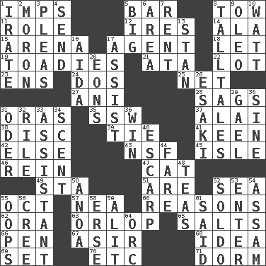 ACROSS 1. Naughty children 5. Drinking establishment 8. Pull behind 11. Hero or heavy, e.g. 12. Angers 14. According to 15. Sports stadium 17. Rep 18. Allow 19. Sycophants 21. _ moment's notice (2 wds.) 22. Car dealer's back yard 23. Followers of ems 24. Two (Sp.) 25. Fish or hair follower 27. Black tropical American cuckoo 28. Droops 31. Mouths or openings 35. Compass dir. 37. Mountain range southwest of Kyrgyzstan 38. Compact _ 39. Standoff 41. Peachy ____! 42. Otherwise 43. Science/research agcy. 45. Capri or Wright 46. It's straight from the horse's mouth 47. Domesticated feline 49. R.R. building 51. "We ___ not amused" (Victoria) 52. Ocean 55. Sep. follower 57. Teachers' org. 60. Thinks logically 62. Mouth or opening 63. Lowest deck of a ship 65. Table seasonings 66. Fenced enclosure 67. SW Saudi Arabia district 68. The main thing one is thinking about 69. Put into a specified state 70. And so on (abbr.) 71. Dormintory (informal) DOWN 1. Feeling or showing extreme anger 2. Person of subnormal intelligence 3. Entreaties 4. Post 5. Massive 6. Length times width 7. Monthly bill 8. Baron Munchausen's specialties 9. Margarine 10. Electrical Unit 13. Comedian Laurel of Laurel & Hardy 16. Opera by Verdi 17. Help 20. Immeasurably long periods of time 26. 1973 Nobel Price Winner (Physics) Leo 29. Highlander 30. Trig term 31. River in Europe 32. Cause heat under the collar 33. Aide 34. Odor 36. Victory 40. Fortification 44. Conductor's collection 48. Afternoon social gatherings 50. Small Philippine buffalo 52. Twentieth part of a lira 53. Keyboard key 54. Indian state 55. I made a mistake 56. Algonquian 58. Celtic language 59. Set down 61. Expressed in words 64. The grampus (Milton)