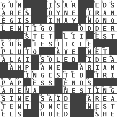 ACROSS 1. Chewing product 4. Austrian river, tributary to the Danube 8. Begley and Asner 11. Ancient Greek god of war 13. Centimeter-gram-second unit of force 14. SW Asia republic 15. Armor plate that protects the chest 16. "If ____ say so..." 17. Words to Nanette 18. Small, flat, pigmented spot on the skin 21. More peculiar 22. Proofreading order 23. Cards in a Roman deck? 25. Eastern Standard Time (abbr.) 26. Gear tooth 29. One of the two male reproductive glands 32. Cartoon dog 34. "___ Maria" 35. Was introduced to 38. Mountain range southwest of Kyrgyzstan 39. Having a sole or soles 41. It may be bright or harebrained 43. Electrical Unit 44. A saturated hydrocarbon 45. Believer in; advocate of (suffix) 46. Consumed 50. Three (prefix) 51. Infant food 54. Curvy letter 55. Conclusions 57. Sports stadium 59. Snuggling 63. Trig term 64. Stated 67. Type of rug 68. Portable shelter 69. Single time 70. A home for chicks 71. Raised railways 72. Wrote a lyric poem 73. A female animal or person DOWN 1. Highlander 2. Goad 3. Count _ (2 wds.) 4. Foolish or stupid persons 5. Symbol (abbr.) 6. Santa ___, CA 7. Marina Del _, California 8. Eat (away) 9. Natives or inhabitants of Denmark 10. Derisive sound 12. Fast planes 14. Working for oneself (abbr.) 19. "Tell ____ the Marines!" 20. Turn to the right 21. Lubricate 23. Not recorded 24. On the rocks 26. Accounting whiz (abbr.) 27. Rounded earthenware pot or jar 28. Island territory of the United States 30. Falsehoods 31. Arab leader 33. Native american tent (variation) 36. Prepare for publication 37. Rend 39. Settles 40. Washington bills 42. Black tropical American cuckoo 45. Sums up 47. Teachers' org. 48. Looked after 49. Compass dir. 51. Thick mixture 52. Satellite of Uranus 53. Actor Sean's family 56. Comedian Laurel of Laurel & Hardy 58. Fish or hair follower 60. Angers 61. Delicate 62. Yard entry 64. "Barney Miller" actor Jack 65. Plus 66. Frozen water