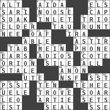 ACROSS 1. The first octave above the treble staff 4. Opera by Verdi 8. Raised railways 11. Indian skirt 13. Trap for birds or small mammals 15. Head covering 16. Neighbor of Neb. 17. An arm off of a larger body of water 18. Musical group of three 19. A person who is older than you are 21. The 19th letter of the Greek alphabet 22. The smallest animal of a litter 23. Born 24. Clumsy lout 27. Retirement account (abbr.) 29. Competent 30. Having gotten out of bed 34. Bar bill 36. Chow _ 39. Give a jingle 40. Hearing organs 41. Goodbye (Sp.) 43. ____ d'Azur (French Riviera) 44. Greek mythologigal hunter 46. Drop; flow; fall 47. 100% 48. Showing deterioration from age 49. At once, immediately (arch.) 51. Shoshoni 53. Science/research agcy. 54. Fast jet (abbr.) 57. Inconspicuous attention getter 60. Nine, plus one 63. Giggle 65. Ubangi River tributary 66. Collection of objects 69. Fly high 70. Lion 71. Nick name for Arthur 72. Arranges properly for use 73. Eastern Standard Time (abbr.) 74. Lick closed 75. Compass dir. DOWN 1. NE Netherlands city 2. Dipping utensil 3. Buy and sell 4. Black tropical American cuckoo 5. Electrically charged atom 6. Dunce 7. At sea 8. Shade of tan 9. (Had) reclined 10. Blemish 12. Eisenhower's nickname 14. Needle holder 18. File 13 20. Director Reiner 25. _ mater 26. Gives food to 28. Hit sharply and swiftly 29. Utter; complete 31. Implement 32. International (abbr.) 33. To sift 34. Small pie 35. Roberta Peters solo 37. One more than two 38. Pitcher Ryan 40. Greek goddess of the dawn 42. Elected reps. 45. Fish or hair follower 50. Often (poetically) 52. Singer James 54. Imelda's hoard 55. Theater features 56. Laconic 57. Whine 58. Observes 59. Position in a hierarchy or organization 61. Blunders 62. Brief written record 64. Curvy letter 67. By way of 68. Snakelike fish