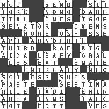 ACROSS 1. Non-commissioned officer (abbr.) 4. Post 8. Be seated 11. Torque (variant) 13. Words to Nanette 14. Have the gumption 15. Slanted text style (abbr.) 16. Singles 17. Russian composer Stravinsky 18. Elected representative 21. Baking chambers 22. Greater amount 23. Order of Saint Francis (abbr.) 25. Compass dir. 26. Fitting 29. Utter; complete 32. One of three equal parts 34. Actress Charlotte 35. Of large size 38. Opera by Verdi 39. Like summer trees 41. Relating to the mouth 43. French article 44. Erode 45. Related on the mother's side 46. Plea 50. Modern: prefix 51. _-fi 54. Double-curved letter 55. "______ My Girl" (Turtles hit) 57. Thick mixture 59. French poetic form 63. Cause heat under the collar 64. "Change" in Tahitian 67. Arab leader 68. Length times width 69. Lodging establishments 70. Baby powder 71. Small child 72. Prepare for publication 73. Affirmative reply DOWN 1. Nuclear Threat Initiatives 2. ____ d'Azur (French Riviera) 3. NW Algerian seaport 4. Sounds asleep 5. A really long time 6. Compass dir. 7. Two (Sp.) 8. Gurus 9. Removes the wrinkles 10. Laconic 12. Dollar (slang) 14. HTML Container Element 19. Frog relative 20. Globe 21. Often (poetically) 23. Norwegian king 24. Chop _ 26. "One Day ___ Time" 27. Silvers or Donahue 28. Event that recurs at intervals 30. Declaim 31. Inky black, to poets 33. To erase 36. SW Asia republic 37. Yard entry 39. Allows 40. Hearing organs 42. Lion 45. Sight organs 47. Born 48. Help 49. Definite Article 51. Small fatty European fish 52. Capital of Egypt 53. Small island 56. Proofreading order 58. Beverage made from leaves 60. "If ____ say so..." 61. Mediterranean tributary 62. Curves 64. Neckwear 65. Plus 66. Corn or form start