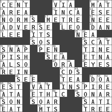 ACROSS 1. Penny 5. By way of 8. Floor protector 11. Type of rug 12. South American Indian 14. Compass dir. 15. Typical models 17. Distance measurement (Brit.) 18. Born 19. Contrary to your interests or welfare 21. Lion 22. One of the 12 tribes of Israel 23. Area sheltered from the wind 24. It is 25. Teachers' org. 27. Mayday 28. Leave at once 31. Fastener 35. Animal enclosure 37. Prong on a fork 38. Expression of disdain 39. Ocean 41. Inactive volcano in Sicily 42. In addition 43. Mouth or opening 45. Snake ____ (dice throw) 46. It's straight from the horse's mouth 47. Music discs 49. Observe 51. Afternoon social gathering 52. ___ good deed 55. Eastern Standard Time (abbr.) 57. Large container 60. Stimulate to action 62. "One Day ___ Time" 63. Principle of right and wrong 65. Underwater navigation system 66. Manchild 67. Fly high 68. Suttee (variant) 69. Consume 70. Mountains (abbr.) 71. Woody plant DOWN 1. Lessep's creation 2. Eat (away) 3. Effrontery 4. Not wild 5. Compete 6. International (abbr.) 7. Measure of real estate 8. Ananias' fault 9. At sea 10. Adolescent 13. Age 16. Indian titles of respect 17. Makes clutter 20. Halt 26. First name in cosmetics 29. Singer Murray 30. Beverages made from leaves 31. Coast Guard woman 32. The longest river in the world 33. Helper 34. Give a jingle 36. Modern: prefix 40. Northern region 44. Arabian gulf 48. Backtalk 50. Nights before holidays 52. Middle Eastern gold or silver currency 53. Declaim 54. Nest on high 55. Comfort 56. Portico 58. Smallest unit of an element 59. Not this but _ 61. Mail 64. Big collection agency