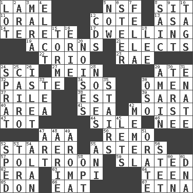 ACROSS 1. Unable to walk 5. Science/research agcy. 8. Be seated 11. Of the mouth 12. ____ d'Azur (French Riviera) 13. White ___ sheet 14. Cylindrical with tapered ends 17. Residence 19. Oak nuts 21. Opts 22. Musical group of three 23. Actress Charlotte 24. _-fi 27. Chow _ 29. Had dinner 32. Thick mixture 34. Distress signal 36. Sign of something about to happen 37. Cause heat under the collar 38. Eastern Standard Time (abbr.) 39. "Two Mules for Sister ____" 40. Length times width 41. Ocean 42. Damp 43. Small child 44. Filth; sediment 46. Born 47. Auto club (abbr.) 50. San ____ (Riviera town) 52. A viewer who gazes fixedly 55. Michaelmas daisies 57. Characterized by complete cowardliness 59. Scheduled 62. Epoch 63. Body of Kaffir warriors 64. Adolescent 65. Spanish title 66. Ingest 67. Inactive volcano in Sicily DOWN 1. Car dealer's back yard 2. "We ___ not amused" (Victoria) 3. Hindu Mythology: god of death 4. Choose 5. At this time 6. Navigate 7. Man or boy (slang) 8. Ketch in the Levant 9. Is not 10. Labels 12. Music discs 15. Singer Mel 16. 4th largest of the Great Lakes 18. Area sheltered from the wind 20. Annoying sounds 24. Small fatty European fish 25. Capital of Egypt 26. Small island 28. Olfactory organs 29. At full speed 30. Laconic 31. Maternal 33. Beverage made from leaves 35. Flight of steps 36. Bear (Spanish) 42. Klaipeda city 45. Allows 47. Nonscientific branch of learning 48. Nest on high 49. Odor 51. Speak pompously 52. Moved rapidly 53. "Corrida" creature 54. Actor Alda or Thicke 55. Black tropical American cuckoo 56. Proofreading order 58. Choose 60. Car or cant ending 61. Heredity factor (abbr.)