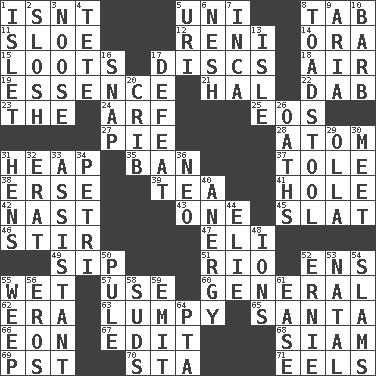 ACROSS 1. Is not 5. Corn or form start 8. Keyboard key 11. _ gin 12. Painter Guido (1575-1642) 14. Mouth or opening 15. Plunders 17. Flat circles 18. Atmosphere 19. Center 21. Actor Linden 22. Pat or tap gently 23. Definite Article 24. Sandy's bark 25. Greek goddess of the dawn 27. Sliced dessert 28. Smallest unit of an element 31. Pile 35. Bar 37. Lacquered or enameled metalware 38. Celtic language 39. Beverage made from leaves 41. Hollow 42. Political cartoonist Thomas 43. Single 45. Narrow board 46. Use a spoon 47. Connecticut Ivy Leaguer 49. Small drink 51. _ de Janeiro 52. Followers of ems 55. Soggy 57. Purpose 60. Commissioned military rank 62. Period 63. Containing lumps 65. Before Barbara or Clara 66. Period of immesurable duration 67. Prepare for publication 68. Thailand, formerly 69. Pacific Standard Time (abbr.) 70. R.R. building 71. Snakelike fish DOWN 1. Small island 2. Agitate, as a liquid 3. Trap for birds or small mammals 4. False hair 5. RI univ. 6. Delicate 7. South American Indian 8. Inedible or poisonous agaric 9. Operatic vocal solo 10. Sharp remark 13. Capri or Wright 16. Fastener 17. Outscore 20. Baby bed with high sides 26. Profane or obscene expressions 29. Water jar 30. Rendezvous 31. Coop moms 32. Part of Q.E.F. 33. Helper 34. _ dish (used to culture cells) 36. Modern: prefix 40. Disorder of the immune system 44. Writer Wiesel 48. Charged atoms 50. Whine 52. Bert's buddy 53. Brizilian seaport 54. Shuts with force 55. Shed a tear 56. Greek god of love 58. Beer foam 59. Give off 61. Comfort 64. Parent Teacher Association (abbr.)
