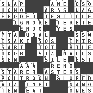 ACROSS 1. Fastener 5. A saturated hydrocarbon 8. Bear (Spanish) 11. Like (prefix) 12. Ancient river in northeast Turkey 13. Tired old horse 14. Worn away 17. A testis 19. Snub 21. Cigar-shaped 22. Inside; within (prefix) 23. Consenting reply 24. Parent Teacher Assoc. 27. Freehold land 29. Compass dir. 32. 1973 Nobel Price Winner (Physics) Leo 34. Distress signal 36. Arab leader 37. Indian skirt 38. Small child 39. Cause heat under the collar 40. Aroma 41. R.R. building 42. Promenades 43. Elected rep. 44. Filth; sediment 46. Eastern Standard Time (abbr.) 47. Auto club (abbr.) 50. San ____ (Riviera town) 52. A viewer who gazes fixedly 55. Michaelmas daisies 57. Characterized by complete cowardliness 59. Inclined 62. _ moment's notice (2 wds.) 63. Body of Kaffir warriors 64. Billionth: prefix 65. Nine, plus one 66. Erode 67. Washington bills DOWN 1. A female animal or person 2. Not either 3. Mine, in Marseilles 4. Puddle 5. "We ___ not amused" (Victoria) 6. Smutty 7. First name in cosmetics 8. Single time 9. Table seasoning 10. Double curve, resembling the letter S 12. Had dinner 15. World-weariness 16. Texas town _ City 18. Big collection agency 20. Cooks with dry heat, as in an oven 24. Mexican monetary units 25. Sadhe (variant) 26. Composer Copland 28. Plunders 29. Grin 30. Beverly of Met fame 31. Take or capture by force 33. Apertif with cassis 35. Flight of steps 36. Epoch 42. Klaipeda city 45. Allows 47. Tate display 48. Nest on high 49. Scent 51. U. of Maine site 52. Argument over a trivial matter 53. Lug 54. ____ Jay Lerner 55. Cuckoo 56. Connect, as a bridge 58. Choose 60. Compass dir. 61. Two (Sp.)