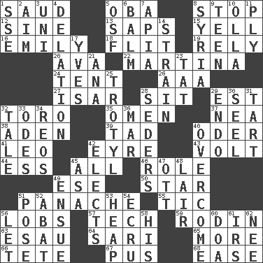ACROSS 1. Saudi Arabian king (1953-1964) 5. Chief or king in Benin or Nigeria 8. Obstruct or block passage 12. Trig term 13. Plant excrements 15. Shout 16. Poet Dickinson 18. Sudden quick movement 19. Have trust in 20. Actress Gardner 22. Chrissie's court nemesis 24. Portable shelter 26. American Automobile Association (abbr.) 27. Austrian river, tributary to the Danube 28. Be seated 29. Eastern Standard Time (abbr.) 32. "Corrida" creature 35. Sign of things to come 37. Teachers' org. 38. An important port of Yemen 39. Small amount or degree 40. Baltic tributary 41. Lion 42. Jane of fiction 43. Electrical Unit 44. Curvy letter 45. Everything 46. Hero or heavy, e.g. 49. Compass dir. 50. Play the lead 51. Flamboyance 55. Nervous spasm 56. Tennis shots 57. Technology 59. "The Thinker" sculptor 63. He sold his birthright 64. Indian skirt 65. Greater amount 66. Wig 67. Ichor 68. Relaxation DOWN 1. Compass dir. 2. Direct toward a target or goal 3. University (slang) 4. Accusation by an informer 5. Order of Saint Francis (abbr.) 6. Lip ointment 7. Capital of Western Samoa 8. Damascus' land 9. Adolescent 10. Water jar 11. Apply oneself diligently 14. Put through a sieve 17. Jacques Cousteau's middle name 21. Santa ___, CA 23. Make lace 25. TNT 28. Spring feasts 29. Inside; within (prefix) 30. Sew up the eyelids of hawks and falcons 31. Small pie 32. Lie 33. Lyric poems 34. Vintage cars 36. Impair 40. Conquer 42. Opts 45. White ___ sheet 47. Baseball player Mel 48. Den 49. Take place subsequently 51. Airs 52. Blind as ____ 53. Pile 54. Shade of tan 56. Allow 58. Part of HMS, perhaps 60. ___ good deed 61. Big collection agency 62. Born