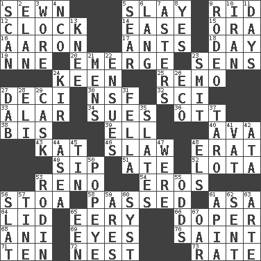 ACROSS 1. Stitched 5. Kill 9. To free from 12. Timepiece 14. Relaxation 15. Mouth or opening 16. Composer Copland 17. Pismires 18. 24 hours 19. Compass dir. 20. Develop 23. Elected reps. 24. Peachy ____! 25. San ____ (Riviera town) 27. Tenth: prefix 30. Science/research agcy. 32. _-fi 33. Having or resembling wings 34. Institutes legal proceedings 36. Baseball player Mel 38. Altar cloth linen 39. Pipe bend 40. Actress Gardner 43. Krazy ___ of comics 46. Cole _ (cabbage dish) 48. Part of Q.E.F. 49. Small drink 51. Had dinner 52. Globular water bottle used in Asia 53. Former U.S. Attorney General Janet 54. Greek god of love 56. Portico 58. Went by 61. White ___ sheet 64. Flaplike covering 65. Suggestive of the supernatural 66. Drug addict 68. Black tropical American cuckoo 69. Snake ____ (dice throw) 70. Virtuous person 71. Nine, plus one 72. A home for chicks 73. Assign a rank or rating to DOWN 1. Examine minutely or intensely 2. Liveliness 3. Had on 4. Non-commissioned officer (abbr.) 5. Wither 6. Austrian-born American filmmaker Fritz 7. Michaelmas daisies 8. It is so 9. Cowboy competition 10. SW Asia republic 11. 24-hour periods 13. Leg joint 21. Not women's 22. Takes place subsequently 23. Stricken, poetically 24. Apertif with cassis 26. Environmental prefix 27. Pat or tap gently 28. Connecticut Ivy Leaguer 29. Keg 31. Chap (slang) 35. Chalkboards 37. Edible starchy tuberous root 41. Large container 42. _ moment's notice (2 wds.) 44. At sea 45. Metal container 47. Past tense of be (plural) 48. Raised railways 50. Wimpy's pal 53. "The Thinker" sculptor 55. Probability 56. Narrow board 57. Prong on a fork 59. Ancient Greek god of war 60. System (abbr.) 61. Capital of Western Samoa 62. Posted 63. Johnson of "Laugh-In" 65. Car or cant ending 67. Boat paddle
