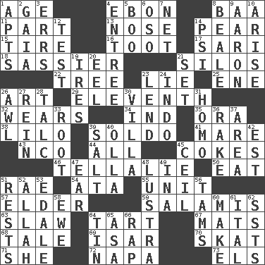 ACROSS 1. Mature 4. Inky black, to poets 8. Sound made by sheep 11. Piece 13. Olfactory organ 14. Lightbulb-shaped fruit 15. Become fatigued 16. A blast of a horn 17. Indian skirt 18. More impudent 21. Grain storage towers 22. Family _ (genealogy) 23. Whopper 25. Compass dir. 26. Tate display 29. Veterans Day date 32. Erodes 34. Working for oneself (abbr.) 35. Mouth or opening 38. _ and Stitch 39. Twentieth part of a lira 41. Female horse 43. Non-commissioned officer (abbr.) 44. 100% 45. Popular sodas 46. Copy Pinocchio 50. Erode 51. Actress Charlotte 54. _ moment's notice (2 wds.) 55. A single undivided whole 57. A person who is older than you are 59. Deli grouping 63. Cole _ (cabbage dish) 64. Small pie 67. Floor coverings 68. Falsehood 69. Austrian river, tributary to the Danube 70. Three-handed card game 71. A female animal or person 72. California wine valley 73. Raised railways DOWN 1. Tenement units (abbr.) 2. Greek goddess of the earth (variant) 3. Blunders 4. Main course 5. Surprise greeting 6. Bear (Spanish) 7. Fish or hair follower 8. Calif. Air Force Base 9. Composer Copland 10. Ascend 12. Trial 14. 23rd letter of the Greek alphabet 19. Angers 20. Snakelike fish 21. Put into a specified state 23. Grant temporary use of 24. Southeast Asian peninsula 26. Leather borer 27. It's straight from the horse's mouth 28. Baby powder 30. Country estate 31. Same (prefix) 33. Carrot, for example 36. Libertine 37. Type of rug 39. Table seasoning 40. Spanish pot 42. Eastern Standard Time (abbr.) 45. To provide with a ceiling 47. Ewer handle 48. A period of five years 49. _ tizzy (2 wds.) 51. Musical pauses 52. Assad's deity 53. Peak District village in England 56. Scottish caps 58. She-sheep 60. Cause to be 61. Slanted text style (abbr.) 62. Fast planes 64. Metal container 65. White ___ sheet 66. Hit sharply and swiftly