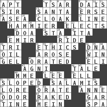 ACROSS 1. Fitting 4. Russian ruler of old 8. Raised platform 12. Title for a knight 13. Before Barbara or Clara 14. Celtic language 15. Toward the sea 17. Covering 18. Actor's bit 19. More given to overacting 21. Opts 23. ___ good deed 24. R.R. building 26. Call ___ day 27. Arab leader 28. Travel on an animal 30. Three (prefix) 31. Principles of right and wrong 34. Heredity factor (abbr.) 37. Lubricate 38. Came up 39. Victory 40. Set 41. Declaimed 42. Connecticut Ivy Leaguer 43. Hindu god of fire 44. Lie 46. Madame (abbr.) 47. Area sheltered from the wind 50. Pipe bend 51. Had an oblique or slanted direction 54. Deli grouping 57. Old wives' tales, e.g. 58. Speak pompously 60. Singer Murray 62. Aroma 63. Moved through 64. Slender fish 65. Prong on a fork 66. Count _ (2 wds.) 67. Health resort DOWN 1. White ___ sheet 2. Expression of disdain 3. Excercise machine 4. Falsehoods 5. Derisive sound 6. _ moment's notice (2 wds.) 7. Immoral or dissolute person 8. Keyboard key 9. N. Chile seaport 10. Is not 11. Observes 13. _-fi 16. Mine, in Marseilles 20. Impair 22. Hats (slang) 25. Ascend 27. 4th largest of the Great Lakes 29. On the rocks 30. Coat; cloak 31. Merit 32. Hang back 33. Being at a high temperature 34. Homes 35. The longest river in the world 36. Black tropical American cuckoo 41. Double curve, resembling the letter S 43. Electrical Unit 44. Beverage made from leaves 45. _ mater 46. Person of subnormal intelligence 48. 1973 Nobel Price Winner (Physics) Leo 49. Ingested 51. Notch 52. Farming town in central California 53. Dormintory (informal) 55. Directed 56. Fastener 59. Actress Charlotte 61. Period