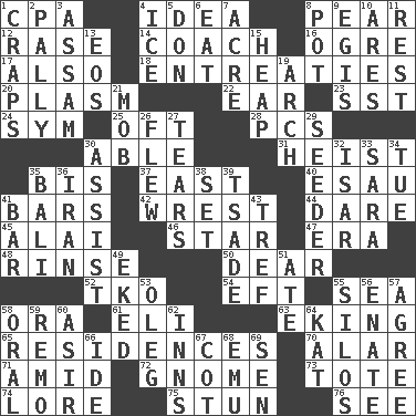 ACROSS 1. Tax preparer (abbr.) 4. The content of cognition 8. Lightbulb-shaped fruit 12. Raze (variant) 14. Team commander 16. Legendary monster 17. In addition 18. Pleas 20. Suffix with ecto or cyto 22. Hearing organ 23. Fast jet (abbr.) 24. Symbol (abbr.) 25. Often (poetically) 28. Personal Computers (abbr.) 30. Competent 31. Robbery 35. Altar cloth linen 37. 90 degrees 40. He sold his birthright 41. Drinking establishments 42. Obtain by seizing forcibly or violently 44. Have the gumption 45. Mountain range southwest of Kyrgyzstan 46. Play the lead 47. Epoch 48. Remove soap 50. Letter starter 52. Ring climax 54. Bank Draft (abbr.) 55. Ocean 58. Mouth or opening 61. Biblical high priest 63. Supplementing with great effort 65. Homes 70. Having or resembling wings 71. Among 72. Dwarf 73. Lug 74. Old wives' tales, e.g. 75. Make senseless or dizzy 76. Perceive with the eye DOWN 1. Dice game 2. Chummy 3. Indian state 4. Frozen water 5. Spanish title 6. Erode 7. Measure of real estate 8. Cooking vessel 9. Armor plate that protects the chest 10. Ancient Greek god of war 11. State of inaction 13. Greek goddess of the dawn 15. Pile 19. Bowlike part 21. Disorderly crowd 26. Soared 27. Rends 29. Sowing specialist 30. Help 32. Austrian river, tributary to the Danube 33. "Two Mules for Sister ____" 34. Third day of the wk. 35. Indonesian resort city 36. SW Asia republic 38. Arrange properly for use 39. Sadhe (variant) 41. Oblong piece of solid material 43. Unclean, religiously 49. Supplemented with great effort 51. Had dinner 53. Cassini of fashion 55. Grain storage towers 56. Maternal 57. Match 58. Spoken 59. San ____ (Riviera town) 60. SW Saudi Arabia district 62. Taverns 64. Krazy ___ of comics 66. Binary compound 67. Small bed 68. Australian flightless bird 69. Elected rep.