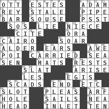 ACROSS 1. Baseball player Mel 4. _____ Park, CO 9. First man 13. Marina Del _, California 14. Lacking originality or spontaneity 15. Corncob 16. Drinking establishment 17. Boozer 18. Inconspicuous attention getter 19. Distress signal 21. Falsehood 22. Sibling's daughter 24. Quote 26. Mouth or opening 27. Capital of Egypt 29. Fly high 30. Tree or shrub in the Birch family 31. Hearing organs 33. Deep reverence 36. Luau course 37. Borne 40. Ocean 41. Elected rep. 42. Floor protectors 43. Musical pauses 45. Narrow board 47. Ascend 48. French article 49. Armor plate that protects the chest 50. Loads 52. Conclude 54. And so on (abbr.) 56. Slit 57. Entreaties 59. Sandy's bark 61. Hollow 62. Travel by water 63. Teachers' org. 64. Froth on beer 65. An arm off of a larger body of water 66. "___ Little Indians" DOWN 1. Globe 2. Beverages made from leaves 3. Polypeptide antibiotic 4. Double-curved letter 5. Took without asking 6. "Change" in Tahitian 7. Otherwise 8. Observe 9. Seem 10. Plate 11. Domed church section 12. Was introduced to 20. Title for a man of rank and authority 22. Trap for birds or small mammals 23. Retirement account (abbr.) 25. Torque (variant) 27. Smile enhancers 28. Medicinal plant 29. Indian titles of respect 31. Part of Q.E.F. 32. Tate display 33. Aide 34. Soaks 35. Relaxation 38. Collect or gather 39. To trail on the ground 44. One of the Great Lakes 45. Scheduled 46. Directed 49. Peak District village in England 50. _ gin 51. Root beer relative 52. Style 53. Famous astronaut Armstrong 55. Algonquian 56. Quiet! 57. 23rd letter of the Greek alphabet 58. Fast jet (abbr.) 60. Air blower