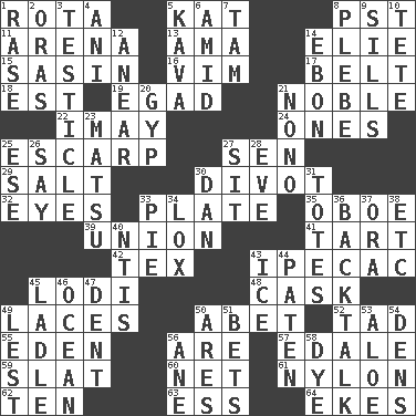 ACROSS 1. Round or rotation of duties 5. Krazy ___ of comics 8. Pacific Standard Time (abbr.) 11. Sports stadium 13. Nursemaid (var.) 14. Writer Wiesel 15. Indian antelope 16. Zeal 17. Waist strap 18. Eastern Standard Time (abbr.) 19. Mild oath 21. Having high moral qualities 22. "If ____ say so..." 24. Singles 25. Fortification 27. Elected rep. 29. Table seasoning 30. A piece of turf (Scot.) 32. Sight organs 33. Food holder 35. Mitch Miller's instrument 39. The state of being joined or united 41. Small pie 42. John Ritter's dad 43. Medicinal drug used to evoke vomiting 45. Farming town in central California 48. Keg 49. Shoestrings 50. Collude with 52. Bit 55. Paradise 56. "We ___ not amused" (Victoria) 57. Peak District village in England 59. Narrow board 60. Fish or hair follower 61. Thermoplastic polyamide 62. Nine, plus one 63. Curvy letter 64. Supplements with great effort DOWN 1. Raze (variant) 2. Mouths or openings 3. One of the two male reproductive glands 4. Cuckoo 5. Polynesian shrub of the pepper family 6. Among 7. Scottish cap 8. Cadet 9. Beverly of Met fame 10. Wig 12. Approach 14. Inky black, to poets 20. Flimflam 21. Words to Nanette 23. Taiwanese island in East China Sea 25. Compass dir. 26. Declare 27. Be seated 28. Night before a holiday 30. One of the 12 tribes of Israel 31. Hauls 33. Sliced dessert 34. Brine-cured salmon 36. Sass 37. Mouth or opening 38. And so on (abbr.) 40. Nuclear Threat Initiatives 43. Frozen water 44. Eucharist need 45. Dipping utensil 46. Sea 47. Incision 49. For fear that 50. Ancient Greek god of war 51. Stakes 53. _ vera 54. Lairs 56. A saturated hydrocarbon 58. Color