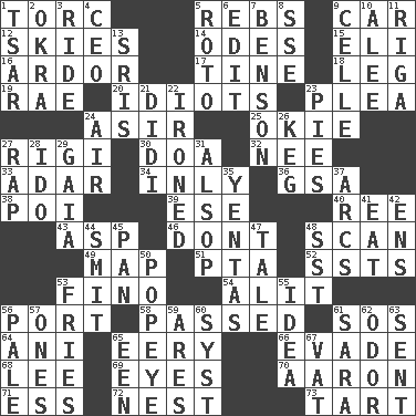 ACROSS 1. Torque (variant) 5. Confederate soldiers (slang) 9. Auto 12. Atmospheres 14. Lyric poems 15. Connecticut Ivy Leaguer 16. Zeal 17. Prong on a fork 18. Part of a journey 19. Actress Charlotte 20. Foolish or stupid persons 23. Entreaty 24. SW Saudi Arabia district 25. Migrant worker of the '30s 27. Swiss mountan, "Queen of the Mountains" 30. ___ good deed 32. Born 33. The sixth month of the Jewish calendar 34. Inwardly 36. Girls' org. (abbr.) 38. Luau course 39. Compass dir. 40. Portuguese money of account (variant) 43. Viper 46. Do not 48. Glance over 49. Atlas unit 51. Parent Teacher Assoc. 52. Fast planes 53. A pale, very dry sherry 54. Came down and settled, as after flight 56. Left side of a ship or aircraft 58. Went by 61. Mayday 64. Black tropical American cuckoo 65. Suggestive of the supernatural 66. Elude 68. Area sheltered from the wind 69. Sight organs 70. Composer Copland 71. Curvy letter 72. Egg locale 73. Small pie DOWN 1. Russian ruler of old 2. Gumbo ingredient 3. Travel on or in a vehicle 4. Corporate head (abbr.) 5. Printing process, for short 6. Prepare for publication 7. Gillaume's butler role 8. Compass dir. 9. Cell (Danish) 10. Toward shelter 11. Capital of Latvia 13. Indian titles of respect 21. "You Light Up My Life" star Conn 22. Pressed 23. Sliced desserts 24. Wind 26. Cask 27. Hit sharply and swiftly 28. Wedding promise 29. Greek goddess of the earth (variant) 31. Columnist Joseph or Stewart 35. Gossips 37. Arches 41. Erode 42. Followers of ems 44. Stricken, poetically 45. Baking dish 47. Story 48. Fast jet (abbr.) 50. Wimpy's pal 53. Strips of potato fried in deep fat 55. It may be bright or harebrained 56. Diluted with white 57. Singles 59. Ancient Greek god of war 60. System (abbr.) 61. "Two Mules for Sister ____" 62. Aroma 63. Emitted 65. Car or cant ending 67. Large container
