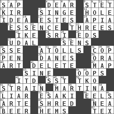 ACROSS 1. Plant excrement 4. Letter starter 8. Proofreading order 12. Apertif with cassis 13. Scorch 14. Opening into or through something 15. The content of cognition 17. _____ Park, CO 18. Capital of Western Samoa 19. Core 21. Threesomes 23. Mamie's husband 24. _ Lanka 26. Begley and Asner 27. Hereditary estate 28. Elected reps. 30. Compass dir. 31. Ringlike coral islands and reefs 34. Police officer (slang) 37. Fenced enclosure 38. Natives or inhabitants of Denmark 39. Mouth or opening 40. Tate display 41. Erase 42. Atlas unit 43. Trig term 44. I made a mistake 46. It would 47. Fast jet (abbr.) 50. Ring climax 51. Put through a sieve 54. Chrissie's court nemesis 57. One who doesn't tell the truth 58. 1973 Nobel Price Winner (Physics) Leo 60. Snakelike fish 62. Johnson of "Laugh-In" 63. Fragment 64. Teachers' org. 65. Fermented drink made from hops 66. Cloth borders 67. John Ritter's dad DOWN 1. What Jean-Claude Killy likes to do 2. Assistant 3. Elected leader of a country 4. Flat circles 5. Keyboard key 6. Grow older 7. Remainder 8. Pottery fragments 9. Drinks excessively 10. Writer Wiesel 11. Afternoon social gatherings 13. Elected rep. 16. "____ silly question..." 20. Snakelike fish 22. Coop moms 25. Small island 27. One who uses or employs something 29. Otherwise 30. Health resort 31. Arabian gulf 32. Stories 33. Single 34. Piece 35. Mouths or openings 36. Infant food 41. "You Light Up My Life" star Conn 43. A viewer who gazes fixedly 44. Baseball player Mel 45. Migrant worker of the '30s 46. Feeling or showing extreme anger 48. Excessive but superficial compliments 49. Proceeds 51. Broad, flat, thick piece 52. Hoop that covers a wheel 53. Tender 55. To free from 56. Toward shelter 59. A female animal or person 61. Saxophone