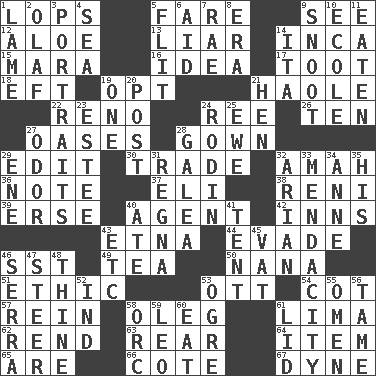 ACROSS 1. Chops off 5. Conductor's collection 9. Observe 12. Medicinal plant 13. One who doesn't tell the truth 14. South American Indian 15. Hindu Mythology: god of death 16. It may be bright or harebrained 17. A blast of a horn 18. Bank Draft (abbr.) 19. Elect 21. White Person, in Hawaii 22. Western Nevada city 24. To separate or throw off 26. "___ Little Indians" 27. Fertile tracts in a desert 28. Long dress 29. Prepare for publication 30. Buy and sell 32. Nanny 36. Short letter 37. Biblical high priest 38. Painter Guido (1575-1642) 39. Celtic language 40. Representative 42. Restaurants 43. Inactive volcano in Sicily 44. Dodge 46. Fast jet (abbr.) 49. Beverage made from leaves 50. Nanny 51. Principle of right and wrong 53. Baseball player Mel 54. Small bed 57. It's straight from the horse's mouth 58. Cassini of fashion 61. Pale green bean 62. Tear apart 63. Buttocks 64. Detail 65. "We ___ not amused" (Victoria) 66. ____ d'Azur (French Riviera) 67. Centimeter-gram-second unit of force DOWN 1. Unable to walk 2. Norwegian king 3. Likenesses of persons 4. Ocean 5. Sudden quick movement 6. Help 7. Actress Charlotte 8. Epoch 9. Snout, nose 10. Learning spot: Fr. 11. Consumed 14. Call ___ day 19. Single 20. Mail 21. Layer 23. First name in cosmetics 24. "The Thinker" sculptor 25. She-sheep 27. Scent 28. An organ shaped like a helmet 29. Compass dir. 31. Rain (Swedish) 32. Believer in; advocate of (suffix) 33. Ananias' fault 34. Singer Murray 35. Part of HMS, perhaps 40. Had dinner 41. Portable shelter 43. And so on (abbr.) 45. Large container 46. Father Junipero _ 47. Bull 48. One or ones belonging to thee 52. Indiana (abbr.) 53. Legendary monster 55. Presage 56. Not wild 58. The grampus (Milton) 59. Lion 60. Consume 61. Flaplike covering