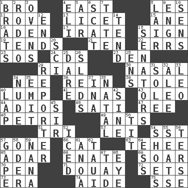 ACROSS 1. Sis' sibling 4. 90 degrees 8. French article 11. Be footloose 13. It is permitted: Lat. 15. One (Scot) 16. An important port of Yemen 17. Feeling or showing extreme anger 18. Omen 19. Looks after 21. "___ Little Indians" 22. Blunders 23. Mayday 24. Music discs 27. Lair 29. Monetary unit of Yemen 30. Relating to the nose 34. Born 36. It's straight from the horse's mouth 39. Took without asking 40. Mass 41. Ferber et al. 43. Margarine 44. Goodbye (Sp.) 46. Suttee (variant) 47. To separate or throw off 48. _ dish (used to culture cells) 49. Pismires 51. Three (prefix) 53. Luau accessory 54. Fast jet (abbr.) 57. Went 60. Domesticated feline 63. Giggle 65. The sixth month of the Jewish calendar 66. Related on the mother's side 69. Fly high 70. Writing instrument 71. A city in N France, SE of Calais 72. Arranges properly for use 73. Period 74. Helper 75. Compass dir. DOWN 1. Naughty children 2. Cowboy competition 3. Baking chambers 4. Biblical high priest 5. Wind 6. Jazz singing style 7. Wig 8. Den 9. Engineer (abbr.) 10. Elected reps. 12. Conclude 14. Be inclined (to) 18. Legislators 20. _-fi 25. Have the gumption 26. Bobsleighs 28. Followers of ems 29. Newsperson 31. Flatfish 32. Toward shelter 33. Lion 34. Unadorned 35. Send forth 37. _ tizzy (2 wds.) 38. Relating to or accompanying birth 40. Infant locale 42. Trig term 45. Title for a knight 50. Teat (slang) 52. On the rocks 54. Imelda's hoard 55. Theater features 56. Laconic 57. Open wide 58. River in Europe 59. Nanny 61. Small Philippine buffalo 62. "Change" in Tahitian 64. Curvy letter 67. Small amount or degree 68. Sight organ