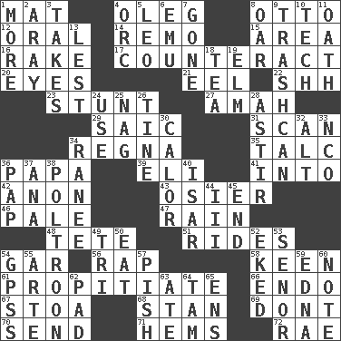 ACROSS 1. Floor covering 4. Cassini of fashion 8. Von Bismarck 12. Of the mouth 14. San ____ (Riviera town) 15. Length times width 16. Immoral or dissolute person 17. Neutralize 20. Sight organs 21. Snakelike fish 22. Quiet! 23. Difficult or unusual or dangerous feat 27. Nanny 29. Ketch in the Levant 31. Glance over 34. Canadian anthropologist Darnell 35. Baby powder 36. Dad 39. Connecticut Ivy Leaguer 41. To the inside or interior of 42. At once, immediately (arch.) 43. Flexible twig of a willow tree 46. Light colored 47. Water falling in drops from the sky 48. Wig 51. Amusement-park features 54. Slender fish 56. Strike 58. Peachy ____! 61. Conciliate 66. Inside; within (prefix) 67. Portico 68. Comedian Laurel of Laurel & Hardy 69. Do not 70. Post 71. Is hesitant and indecisive 72. Actress Charlotte DOWN 1. Greater amount 2. Like ___ of sunshine 3. Receives possession of 4. The grampus (Milton) 5. Lion 6. Australian flightless bird 7. Went 8. Rowing implement 9. File 13 10. Technology 11. Pledge 13. For fear that 18. Afternoon social gathering 19. Shade tree 24. Purpose 25. Tired old horse 26. Prong on a fork 28. Moving or stirring 30. Bodily heat indicating an inflammation 32. The first octave above the treble staff 33. Non-commissioned officer (abbr.) 34. The wife of a rajah (variant) 36. Infant food 37. Santa ___, CA 38. Coward 40. Austrian river, tributary to the Danube 44. One more than two 45. Conclude 49. Three (prefix) 50. Consume 52. Made supply last 53. Sir (Sp.) 54. Global Positioning Systems (abbr.) 55. Johnson of "Laugh-In" 57. Expression of disdain 59. Pulitzer Prize-winning author Ferber 60. Musical sound 62. Groovy apt. 63. Had dinner 64. Scottish cap 65. Followers of ems
