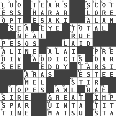 ACROSS 1. Nilotic language 4. Pulls into pieces 9. Highlander 13. Double-curved letter 14. Ethiopian city, capital of Harari 15. Old wives' tales, e.g. 16. Elect 17. 1973 Nobel Price Winner (Physics) Leo 18. Actor Alda or Thicke 19. Ocean 21. Sight organ 22. Add up to 24. Actress Patricia 26. Regret 27. Mexican monetary units 29. Put down 30. Place in a line 31. Jai _ 33. Before (prefix) 36. HTML Container Element 37. Inveterate users 40. Boat paddle 41. Observe 42. Whirlpool 43. Tarsus (plural) 45. Ancient river in northeast Turkey 47. First name in cosmetics 48. Cartoonist voice _ Blanc 49. Tumult 50. Drinks excessively 52. Leather borer 54. Actress Charlotte 56. Male parent of an animal 57. Relatively large 59. Naughty child 61. Coast Guard woman 62. National forest in Provo, Utah 63. Teat (slang) 64. Prong on a fork 65. Taiwanese island in East China Sea 66. R.R. building DOWN 1. Lion 2. United States Postal Service (abbr.) 3. Clearly or manifestly demonstrative 4. Definite Article 5. Artist's stand 6. Like ___ of sunshine 7. Libertine 8. _ Lanka 9. Scheduled 10. Root beer relative 11. Spoken 12. Nine, plus one 20. A really long time 22. Distinguishing feature 23. Fr. "Yes" 25. At sea 27. Groovy apts. 28. Writer Wiesel 29. Made of lace 31. Does sums 32. Flaplike covering 33. Likenesses of persons 34. Raze (variant) 35. 4th largest of the Great Lakes 38. Allots cards 39. Proofreading order 44. SW Saudi Arabia district 45. Electrical Unit 46. To sift 49. Narrow boards 50. Native american tent (variation) 51. NW Algerian seaport 52. Operatic vocal solo 53. Left 55. Send forth 56. Fast jet (abbr.) 57. Chewing product 58. The 19th letter of the Greek alphabet 60. Parent Teacher Assoc.