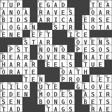ACROSS 1. Uncastrated adult male sheep 4. Mild oath 8. Afternoon social gathering 11. Small Philippine buffalo 13. All-night dance parties 15. Boat paddle 16. Auction offers 17. N. Chile seaport 18. Celtic language 19. Utah city north of Ogden 21. Title for a knight 22. Globular water bottle used in Asia 23. Compass dir. 24. Bank Draft (abbr.) 27. Frozen water 29. Play the lead 30. Baking chambers 34. Pacific Standard Time (abbr.) 36. Words to Nanette 39. Mexican monetary units 40. Posterior 41. Unconcealed 43. Nathan's nickname 44. Ethiopian city, capital of Harari 46. Snakelike fish 47. Third day of the wk. 48. Speak pompously 49. Pledge 51. "___ Little Indians" 53. Adept person 54. Allow 57. _ and Stitch 60. Shoshoni 63. Michael Jackson trademark 65. Genesis locale 66. Methods 69. SW Saudi Arabia district 70. Elected rep. 71. Beat drum 72. Antes 73. Small boy 74. Labels 75. Actress Charlotte DOWN 1. Eating place 2. The state of being joined or united 3. Porridge 4. Epoch 5. Slender fish 6. Opinion 7. Tenth: prefix 8. "Corrida" creature 9. 90 degrees 10. Length times width 12. White ___ sheet 14. Indian skirt 18. Veterans Day date 20. Fish or hair follower 25. Papal veil 26. Collection of objects 28. Police officer (slang) 29. Ski resort town in Vermont 31. He sold his birthright 32. Brief written record 33. Compass dir. 34. Lightbulb-shaped fruit 35. "Two Mules for Sister ____" 37. Born 38. Fourth or lowest deck 40. 17th letter of the Greek alphabet 42. Russian ruler of old 45. To sift 50. Coat; cloak 52. Unfeeling 54. Failure 55. Webber/Rice musical 56. Laconic 57. For fear that 58. The content of cognition 59. Grant temporary use of 61. A blast of a horn 62. Pulitzer Prize-winning author Ferber 64. Experiment locale 67. Oval reproductive body of a fowl 68. Distress signal