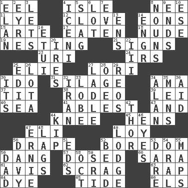 ACROSS 1. Snakelike fish 4. Small island 8. Born 11. Sodium hydroxide 12. Garlic unit 14. Immeasurably long periods of time 15. Johnson of "Laugh-In" 17. Ingested 18. Unadorned 19. Snuggling 21. Signals 23. RI univ. 24. Big collection agency 25. Writer Wiesel 27. Australian parrot (variant) 30. Wedding promise 31. Fodder prepared in a silo 34. Nanny (var.) 37. Teat (slang) 38. Cowboy competition 39. Luau accessory 40. Ocean 41. Most capable 43. Plus 44. Leg joint 45. Coop moms 47. Connecticut Ivy Leaguer 49. Myrna of the movies 50. Window treatment 52. Mood resulting from idleness 56. Mild oath, euphamism for damn 57. Administered medicine 60. "Two Mules for Sister ____" 61. Opinion 62. Strangle with an iron collar 63. Strike 64. Color 65. Periodic rise and fall of the sea level 66. Raised railways DOWN 1. Flair 2. Jane of fiction 3. Allows 4. Ancient Celtic tribe of eastern Britain 5. Volcanic refuse 6. Car dealer's back yard 7. Night before a holiday 8. Parts of speech 9. Extremities 10. Compass dir. 13. Followers of ems 14. Engineer (abbr.) 16. Needle holder 20. Angers 22. One more than two 25. Singer Brickell 26. Globular water bottle used in Asia 27. Dipping utensil 28. Double curve, resembling the letter S 29. Vintage cars 30. It is 32. SW Asia republic 33. Ear part 34. Actor Alda or Thicke 35. Not women's 36. Help 42. Son of Odin 44. Monetary unit of Laos 46. Sight organs 47. Bert's buddy 48. Falls behind 49. Cabin 50. American folk hero Crockett 51. Begley and Asner 52. Necklace unit 53. Have the gumption 54. Spoken 55. Atlas contents 56. June honoree 58. Sep. follower 59. _ Lanka