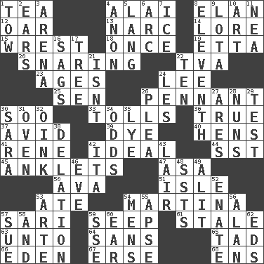 ACROSS 1. Beverage made from leaves 4. Mountain range southwest of Kyrgyzstan 8. Liveliness 12. Rowing implement 13. Drug cop 14. Old wives' tales, e.g. 15. Take or capture by force 18. At one time in the past 19. Singer James 20. Catching in a trap 22. Federal power corp. 23. Ripens 24. Area sheltered from the wind 25. Elected rep. 26. Pre-World Series prize 30. "Barney Miller" actor Jack 33. For Whom the Bell _____ 36. Loyal 37. Enthusiastic 39. Color 40. Coop moms 41. French philosopher Descartes 42. Standard of perfection 44. Fast jet (abbr.) 45. Short socks 47. White ___ sheet 50. Actress Gardner 51. Small island 53. Had dinner 54. Chrissie's court nemesis 57. Indian skirt 59. Ooze 61. Having lost freshness 63. To (old English) 64. Without 65. Small boy 66. Paradise 67. Celtic language 68. Followers of ems DOWN 1. Pull behind 2. Hearing organs 3. Sports stadium 4. Soon (poet.) 5. Long (Scottish) 6. Curve 7. Frozen water 8. Veterans Day date 9. Globular water bottle used in Asia 10. Tate display 11. Teachers' org. 16. Sinks 17. Woody plant 21. Is not 22. "___ Little Indians" 24. French article 26. Entreaty 27. Ancient Greek god of war 28. Religious women 29. Trial 30. "Two Mules for Sister ____" 31. Baking chamber 32. Pig sound 34. Probability 35. Potassium hydroxide 38. Accusation by an informer 42. Call ___ day 43. Den 46. First lady 48. Fast planes 49. Came down and settled, as after flight 52. Related on the mother's side 53. Johnson of "Laugh-In" 54. Not women's 55. Domed church section 56. ____ Jay Lerner 57. Institute legal proceedings 58. Added to 59. Compass dir. 60. Hearing organ 62. Begley and Asner