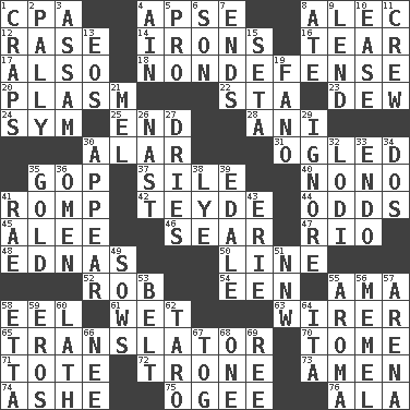 ACROSS 1. Accounting whiz (abbr.) 4. Domed church section 8. Actor Baldwin 12. To erase 14. Removes the wrinkles 16. Rend 17. In addition 18. Unrelated to defense, as in spending 20. Suffix with ecto or cyto 22. R.R. building 23. Morning condensation 24. Symbol (abbr.) 25. Conclude 28. Black tropical American cuckoo 30. Having or resembling wings 31. Stared at amorously 35. Republican Party 37. Filth; sediment 40. Words to Nanette 41. Play 42. Miss Universe 1986, Barbara Palacios _ 44. Likelihood 45. Toward shelter 46. Singe 47. River (Sp.) 48. Ferber et al. 50. Actor's bit 52. Director Reiner 54. Car or cant ending 55. Wet nurse (var.) 58. Snakelike fish 61. Dripping 63. One who wires 65. Interpreter 70. Heavy book 71. Haul 72. Heavy duty weighing machine 73. So be it 74. American tennis player Robert 75. Double curve, resembling the letter S 76. Wing DOWN 1. Dice game 2. Chummy 3. Indian state 4. The 18th letter of the Arabic alphabet 5. Adept person 6. Male child 7. Extremities 8. Had dinner 9. Grant temporary use of 10. Comfort 11. Group working together 13. Greek goddess of the dawn 15. Bristle 19. Papal veil 21. Cartoonist voice _ Blanc 26. Political cartoonist Thomas 27. Frees from moisture 29. Disregard 30. Become visible 32. Farming town in central California 33. Inside; within (prefix) 34. Two (Sp.) 35. Gilded 36. Sign of something about to happen 38. Sodium hydroxide 39. Peak District village in England 41. Actress Charlotte 43. 4th largest of the Great Lakes 49. Sty mamas 51. Compass dir. 53. Waist strap 55. Scent 56. Klaipeda city 57. Sports stadium 58. Singer James 59. Greek god of love 60. Thin strip of wood or metal 62. Pacific island yam 64. Call ___ day 66. Born 67. Coat; cloak 68. Single 69. To separate or throw off