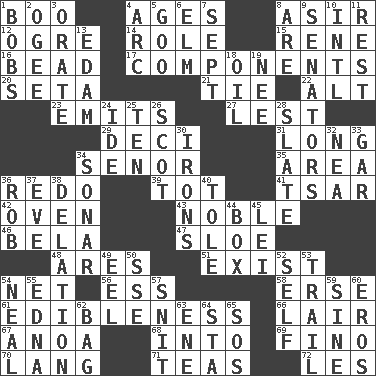 ACROSS 1. Surprise greeting 4. Matures 8. SW Saudi Arabia district 12. Legendary monster 14. Hero or heavy, e.g. 15. French philosopher Descartes 16. Necklace unit 17. Pieces 20. Stalk of a moss capsule 21. Neckwear 22. The first octave above the treble staff 23. Gives off 27. For fear that 29. Tenth: prefix 31. Having great length 34. Sir (Sp.) 35. Type of rug 36. Do over again 39. Small child 41. Russian ruler of old 42. Baking chamber 43. Impressive in appearance 46. Actor Lugosi 47. A type of plum 48. Ancient Greek god of war 51. Have an existence 54. Fish or hair follower 56. Curvy letter 58. Celtic language 61. The property of being fit to eat 66. Den 67. Small Philippine buffalo 68. To the inside or interior of 69. A pale, very dry sherry 70. Long (Scottish) 71. Beverages made from leaves 72. French article DOWN 1. Moves up and down 2. Double curve, resembling the letter S 3. Declaim 4. Curve 5. Thick or sticky substance 6. Shade tree 7. Back-to-school mo. 8. "We ___ not amused" (Victoria) 9. Legislators 10. International (abbr.) 11. Repose 13. Dutch treat 18. Lubricate 19. Born 24. Binary compound 25. Nine, plus one 26. Highlander 28. Schedule 30. Metal shackles 32. Teachers' org. 33. Slender fish 34. Echolocation 36. Director Reiner 37. First lady 38. Accusation by an informer 40. Lacquered or enameled metalware 44. Gift holder 45. Luau accessory 49. Snakelike fish 50. Compass dir. 52. Oneself 53. Get behind 54. Actress Patricia 55. Pulitzer Prize-winning author Ferber 57. In a ____ (agitated or irritated) 59. Trig term 60. Greek god of love 62. Paper or plastic container 63. Compass dir. 64. R.R. building 65. Distress signal