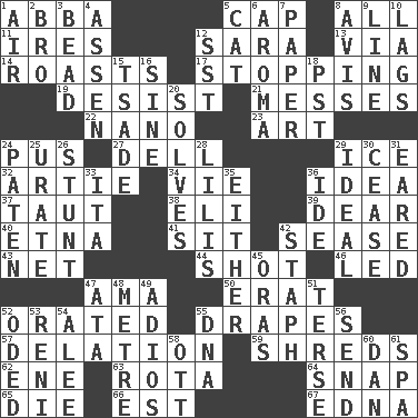 ACROSS 1. Swedish rock group 5. Head covering 8. 100% 11. Angers 12. "Two Mules for Sister ____" 13. By way of 14. Exposes to great heat 17. Closing up, plugging up 19. Cease 21. Makes clutter 22. Billionth: prefix 23. Nonscientific branch of learning 24. Suppuration 27. Small valley 29. Frozen water 32. Nick name for Arthur 34. Compete 36. The content of cognition 37. Tense 38. Biblical high priest 39. Letter starter 40. Inactive volcano in Sicily 41. Be seated 42. Gospel singer Marvin 43. Fish or hair follower 44. Went for two points 46. Directed 47. Nursemaid (var.) 50. Part of Q.E.F. 52. Spoke pompously 55. Window treatments 57. Accusation by an informer 59. Tears up 62. Compass dir. 63. Round or rotation of duties 64. Fastener 65. Expire 66. Eastern Standard Time (abbr.) 67. Pulitzer Prize-winning author Ferber DOWN 1. Atmosphere 2. Sis' sibling 3. Necklace unit 4. NE Netherlands city 5. Domesticated feline 6. Odor 7. Some stationery 8. Advice 9. Actor's bit 10. Falls behind 12. Fast jet (abbr.) 15. Sadhe (variant) 16. Trig term 18. Pacific Standard Time (abbr.) 20. Finds the solution 24. Eucharist need 25. A salt of uric acid 26. Difficult or unusual or dangerous feat 28. Ms. Damita and namesakes 29. Perfect 30. Stop 31. Having ears or earlike features 33. Call ___ day 35. One or the other 36. Binary compound 42. Staphylococcus 45. Mouths or openings 47. _ moment's notice (2 wds.) 48. Distance measurement (Brit.) 49. Goodbye (Sp.) 51. Laconic 52. Wrote a lyric poem 53. Painter Guido (1575-1642) 54. Toward shelter 55. Heredity factor (abbr.) 56. Post 58. Baseball player Mel 60. Daniel's nick name 61. Health resort