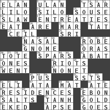 ACROSS 1. Flair 5. ____ Bator, Mongolia 9. Russian ruler of old 13. _ and Stitch 14. Grain storage tower 15. Lush 16. Cole _ (cabbage dish) 17. Pleas 19. Erode 20. "We ___ not amused" (Victoria) 21. Spoil 22. Make lace 23. To provide with a ceiling 25. Indian title of respect (Mr.) 26. Rhinal 30. Loose flowing garment 34. Dwarf 35. Mouths or openings 36. Carry 39. Practice fights 42. Blind as ____ 43. Washington bills 44. Debaucheries 46. Gone 47. Music written for nine 48. Purulenc 51. Fast planes 54. Connecticut Ivy Leaguer 57. "One Day ___ Time" 58. Floor protector 60. Had dinner 62. Homes 65. Inky black, to poets 66. Table seasonings 67. Hyperbolic tangent 68. Aureate 69. Made supply last 70. Domed church section 71. Leaves DOWN 1. Otherwise 2. Pale purple color 3. Having winglike extensions 4. Immediately 5. One who makes use of a thing 6. Actor's bit 7. Keyboard modifier key 8. Typical models 9. Small child 10. Set of matching outer garments 11. Toward the sea 12. Relief 15. Indian skirt 18. Ewer handle 20. ____ Jay Lerner 24. Eat 27. Distress signal 28. Electrical Unit 29. Acquire or gain knowledge or skills 30. Exposes to great heat 31. Globe 32. Sound made by sheep 33. Eastern Standard Time (abbr.) 36. Pull behind 37. Single 38. Nine, plus one 40. River (Sp.) 41. Male offspring 45. Trial 48. Groovy apts. 49. Shoshoni 50. Before Barbara or Clara 52. Off limits 53. Fur scarf 54. Celtic language 55. Path through which fluid escapes 56. Small island 58. Not women's 59. American tennis player Robert 61. Conclusions 63. It would 64. Head covering 65. Ovum