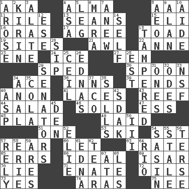ACROSS 1. Alias (abbr.) 4. _ mater 8. American Automobile Association (abbr.) 11. Cause heat under the collar 13. Actors Connery and Penn 15. Biblical high priest 16. Mouths or openings 17. Match 18. Frog relative 19. Locates 21. Leather borer 22. Singer Murray 23. Compass dir. 24. Frozen water 27. Opposite of masc. 29. Broke a traffic law 30. Soup utensil 34. Adept person 36. Taverns 39. Looks after 40. Soon (poet.) 41. Shoestrings 43. Coral collection 44. Vegetable dish 46. Disposed of to a purchaser 47. Double-curved letter 48. Food holder 49. Put down 51. Single 53. What Jean-Claude Killy likes to do 54. Fast jet (abbr.) 57. Bring up, as a child 60. Allow 63. Feeling or showing extreme anger 65. Blunders 66. Perfect 69. Austrian river, tributary to the Danube 70. Whopper 71. Maternal 72. Lubricates 73. It is so 74. Ancient river in northeast Turkey 75. Born DOWN 1. Came up 2. Japanese brewing company 3. Having winglike extensions 4. White ___ sheet 5. Part of a journey 6. Hindu Mythology: god of death 7. Afresh 8. Period of immesurable duration 9. Actor Alda or Thicke 10. Assistant 12. Compass dir. 14. Automatically 18. ________ with (broke a safety seal) 20. Small drink 25. To provide with a ceiling 26. Ferber et al. 28. Eastern Standard Time (abbr.) 29. Legislators 31. Singles 32. Lyric poems 33. Overdraft (abbr.) 34. Of or related to the anus 35. Root beer relative 37. Non-commissioned officer (abbr.) 38. Makes a sale 40. Viper 42. Neighbor of Neb. 45. Lair 50. One more than two 52. Writer Wiesel 54. Indian antelope 55. Having lost freshness 56. Laconic 57. Have trust in 58. 4th largest of the Great Lakes 59. Ancient Greek god of war 61. Pulitzer Prize-winning author Ferber 62. Separate forcefully 64. River (Sp.) 67. _ moment's notice (2 wds.) 68. French article