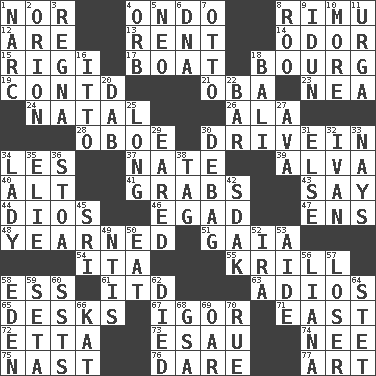 ACROSS 1. And not 4. Southwest Nigerian state 8. Tall New Zealand timber tree 12. "We ___ not amused" (Victoria) 13. Monthly bill 14. Scent 15. Swiss mountan, "Queen of the Mountains" 17. Water vessel 18. Town 19. Continued (abbr.) 21. Chief or king in Benin or Nigeria 23. Teachers' org. 24. Relating to or accompanying birth 26. Insect wing 28. Mitch Miller's instrument 30. Popular '50s hangout 34. French article 37. Nathan's nickname 39. Inventor's middle name 40. Keyboard modifier key 41. Seizes 43. Declare 44. "Vaya con ____" 46. Mild oath 47. Followers of ems 48. Felt deep pity or tenderness 51. Greek goddess of the earth (variant) 54. Call ___ day 55. The principal food of baleen whales 58. Double-curved letter 61. It would 63. Goodbye (Sp.) 65. Writing tables 67. Russian composer Stravinsky 71. Compass direction 72. Singer James 73. He sold his birthright 74. Born 75. Political cartoonist Thomas 76. Have the gumption 77. Tate display DOWN 1. Drug cop 2. Constellation of myth 3. Rain (Swedish) 4. Globe 5. Modern: prefix 6. Heredity factor (abbr.) 7. Von Bismarck 8. Friend of Pooh 9. Goddess of spring and wife of Bragi 10. Greater amount 11. Capital and largest city of Mongolia 16. "Tell ____ the Marines!" 18. Indonesian resort city 20. Pat or tap gently 22. Tavern 25. Having great length 27. Actress Gardner 29. Having ears or earlike features 30. Debunk (Brit. slang) 31. Otherwise 32. "Terrible" tsar 33. Negative votes 34. Kenny Rogers chart-topper in '80 35. Writer Wiesel 36. Portico 38. Label 42. Neighbor of Neb. 45. Indian title of respect (Mr.) 49. Nuclear Threat Initiatives 50. Consume 52. Lyricist Gershwin 53. Assistant 56. Woody, climbing, usually tropical plant 57. Failure 58. Genesis locale 59. Bristle 60. Fast planes 62. Passed on 64. Proofreading order 66. Krazy ___ of comics 68. Girls' org. (abbr.) 69. Rowing implement 70. Sorrow