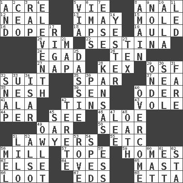 ACROSS 1. 1/640 square mile 5. Compete 8. Of or related to the anus 12. Be tempered by heat 13. "If ____ say so..." 15. Undercover agent 16. Drug addict 18. Domed church section 19. Old (Scot.) 20. Zeal 22. French poetic form 24. Mild oath 26. "___ Little Indians" 27. California wine valley 28. A weed 29. Order of Saint Francis (abbr.) 32. Costume for a special activity 35. Coast Guard woman 37. Teachers' org. 38. Tender 39. Elected rep. 40. Baltic tributary 41. Insect wing 42. Metal containers 43. Grand slam 44. For each 45. Observe 46. _ vera 49. Rowing implement 50. Burn superficially 51. Those who practice law 55. And so on (abbr.) 56. Place where flour is made 57. Drink excessively 59. Residences 63. Otherwise 64. Nights before holidays 65. Vertical spar for supporting sails 66. Plunder 67. Begley and Asner 68. Singer James DOWN 1. Plus 2. Corporate head (abbr.) 3. Hit sharply and swiftly 4. Veterans Day date 5. By way of 6. Naughty children 7. Comfort 8. At full speed 9. Part of speech 10. Silent film actress Nazimova 11. Directed 14. Last past 17. Capital of Latvia 21. Atlas unit 23. John Ritter's dad 25. Small ungulate mammals of Africa 28. Sunflower state 29. Southwest Nigerian state 30. Sew up the eyelids of hawks and falcons 31. Conductor's collection 32. Fastener 33. Ubangi River tributary 34. Austrian river, tributary to the Danube 36. Writing instrument 40. Conquer 42. Cigar-shaped 45. Declare 47. Area sheltered from the wind 48. Pledge 49. A small or young owl 51. _ and Stitch 52. In addition 53. Be footloose 54. Broke a traffic law 56. Cartoonist voice _ Blanc 58. Double-curved letter 60. Floor covering 61. Eastern Standard Time (abbr.) 62. R.R. building