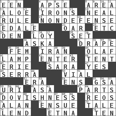 ACROSS 1. Car or cant ending 4. Domed church section 8. Type of rug 12. Medicinal plant 14. Removes the wrinkles 16. Be tempered by heat 17. Governing power 18. Unrelated to defense, as in spending 20. Peak District village in England 22. Boat paddle 23. And so on (abbr.) 24. Lair 25. Myrna of the movies 28. Put into a specified state 30. "____ silly question..." 31. Window treatment 35. Opposite of masc. 37. SW Asia republic 40. Norwegian king 41. Desk light 42. Keyboard key 44. Portable shelter 45. 4th largest of the Great Lakes 46. "Two Mules for Sister ____" 47. It is so 48. Father Junipero _ 50. Small bottle 52. Period 54. Followers of ems 55. Girls' org. (abbr.) 58. RI univ. 61. White ___ sheet 63. Actors' quests 65. Innocence, gentleness, or tenderness 70. Vintage cars 71. Actor Alda or Thicke 72. Take place subsequently 73. Story 74. Grant temporary use of 75. Inactive volcano in Sicily 76. Nine, plus one DOWN 1. Having ears or earlike features 2. Dodge 3. Pitcher Ryan 4. The 18th letter of the Arabic alphabet 5. Adept person 6. Boy, to dad 7. Inside; within (prefix) 8. One (Scot) 9. French philosopher Descartes 10. Compass direction 11. Actor Baldwin 13. Snakelike fish 15. Oceans 19. Flintstone 21. Raised railways 26. Migrant worker of the '30s 27. Entertaining tales 29. Trinitrotoluene 30. Electrical Unit 32. Toward shelter 33. Baking dishes 34. Newt 35. Conductor's collection 36. Independent ruler or chieftain 38. "One Day ___ Time" 39. Impudent aggressiveness 41. French article 43. Water falling in drops from the sky 49. Caspian sea tributary 51. Viper 53. American tennis player Robert 55. Relatively large 56. Fur scarf 57. NE Netherlands city 58. Allodial 59. Hero or heavy, e.g. 60. "Terrible" tsar 62. Queen of England 1702-14 64. Nonscientific branch of learning 66. Indiana (abbr.) 67. Eastern Standard Time (abbr.) 68. Player for Phoenix 69. Ocean