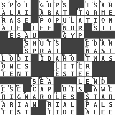 ACROSS 1. Specific locale 5. Republicans 9. Russian ruler of old 13. Mountain range southwest of Kyrgyzstan 14. Blind as ____ 15. Singer Mel 16. Raze (variant) 17. Census information 19. Had dinner 20. Area sheltered from the wind 21. Not either 22. Be seated 23. He sold his birthright 25. Hustle 26. Particles of soot 30. Dutch treat 34. Small fatty European fish 35. Political cartoonist Thomas 36. Farming town in central California 39. Potato state 42. It was, poetically 43. Washington bills 44. 61 cubic inches 46. Portable shelter 47. First name in cosmetics 48. Ocean 51. Grant temporary use of 54. Compass dir. 57. Head covering 58. Twice 60. Deep reverence 62. Complicated, petty procedures 65. Play the lead 66. Believer in; advocate of (suffix) 67. Monetary unit of Yemen 68. Friends 69. Trial 70. Periodic rise and fall of the sea level 71. Toward shelter DOWN 1. "Two Mules for Sister ____" 2. Food holder 3. Fertile tracts in a desert 4. Make a knot 5. Open wide 6. Mitch Miller's instrument 7. Infant food 8. Feeling sharp psychological pain 9. Small child 10. Indian titles of respect 11. Mine, in Marseilles 12. Monthly bill 15. Canvas cover 18. Myrna of the movies 20. Mass 24. Aid 27. RI univ. 28. Small amount or degree 29. Showing deterioration from age 30. Main course 31. Fool 32. White ___ sheet 33. Mountains (abbr.) 36. Car dealer's back yard 37. Single 38. Lair 40. Part of HMS, perhaps 41. Baseball player Mel 45. Snakelike fish 48. Glance over 49. Hearing organ 50. To the left, to Queeg 52. Relating to or accompanying birth 53. A sleeping potion; an opiate (poet.) 54. Part of Q.E.F. 55. Title for a man of rank and authority 56. The front part of a cuirass 58. Necklace unit 59. Capri or Wright 61. Celtic language 63. Floor covering 64. Cards in a Roman deck? 65. Health resort