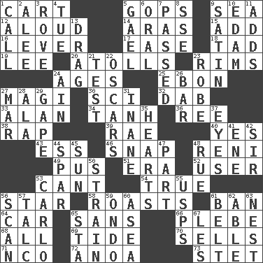 ACROSS 1. Haul 5. Republicans 9. Ocean 12. Verbally 14. Ancient river in northeast Turkey 15. Say or write further 16. Crowbar 17. Comfort 18. Small boy 19. Area sheltered from the wind 20. Ringlike coral islands and reefs 23. Basketball hoops 24. Eras 25. Inky black, to poets 27. Wise men 30. _-fi 32. Apply (a substance) by light strokes 33. ____ Jay Lerner 34. Hyperbolic tangent 36. To riddle 38. Reproach for some lapse or misdeed 39. Actress Charlotte 40. It is so 43. Curvy letter 46. Fastener 48. Painter Guido (1575-1642) 49. Ichor 51. Period 52. One who uses or employs something 53. Patter 54. Loyal 56. Play the lead 58. Cooks with dry heat, as in an oven 61. Forbid 64. Automobile 65. Without 66. First-year military academy student 68. 100% 69. Event that recurs at intervals 70. Exchanges for money 71. Non-commissioned officer (abbr.) 72. Small Philippine buffalo 73. Proofreading order DOWN 1. Give a ring to 2. Toward shelter 3. Be footloose 4. Third day of the wk. 5. Highlander 6. Of the mouth 7. Went by 8. Compass dir. 9. Smooth fabric 10. Dutch treat 11. Does sums 13. To be drawn or hauled along 21. Trial 22. Motion picture awards 23. Loose flowing garment 24. The 18th letter of the Arabic alphabet 26. Oblong piece of solid material 27. Make imperfect 28. Chicken ___ king 29. Open wide 31. Empty; void 35. Centers of feelings and intuitions 37. Sight organs 41. Compass dir. 42. Title for a knight 44. Coast Guard woman 45. Player for Phoenix 47. Role in a play 48. Regret 50. Put through a sieve 53. Monte _, Las Vegas Hotel/Casino 55. United States Postal Service (abbr.) 56. Glance over 57. Baby powder 59. Southwest Nigerian state 60. Toward the sea 61. Waist strap 62. Competent 63. Egg locale 65. R.R. building 67. French article