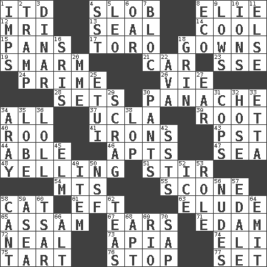 ACROSS 1. It would 4. Oscar Madison type 8. Writer Wiesel 12. Medical imaging device (abbr.) 13. Lick closed 14. Calm and collected 15. Zero-star reviews 17. "Corrida" creature 18. Brides' dresses 19. Excessive but superficial compliments 21. Auto 23. Compass dir. 24. First class 26. Compete 28. Arranges properly for use 30. Flamboyance 34. 100% 37. Southern CA. univ. 39. Carrot, for example 40. Friend of Pooh 41. Metal shackles 43. Pacific Standard Time (abbr.) 44. Competent 46. Flats, for short 47. Ocean 48. Crying or shouting loudly 51. Use a swizzle stick 54. Mountains (abbr.) 55. Biscuitlike quick bread 58. Feline 61. Newt 63. Evade 65. Indian state 67. Hearing organs 71. Dutch treat 72. Be tempered by heat 73. Capital of Western Samoa 74. Biblical high priest 75. Small pie 76. Halt 77. Put into a specified state DOWN 1. Naughty children 2. _____ steamer (cargo ship) 3. Middle Eastern gold or silver currency 4. Fast jet (abbr.) 5. Lion 6. Boat paddle 7. Group of countries in special alliance 8. Environmental prefix 9. Moos 10. Charged particles 11. Otherwise 16. Indian titles of respect 18. Amused look 20. Madame (abbr.) 22. Actress Gardner 25. Needle holder 27. Ewer handle 29. Strangle with an iron collar 30. Leg coverings 31. 911 reaches them 32. Flexible conduit 33. Singer James 34. Like ___ of sunshine 35. Ear part 36. Hang loosely or laxly 38. Trim (branches) 42. Fast planes 45. Shade tree 49. A whole individual unit 50. Overdraft (abbr.) 52. Frozen water 53. Hero or heavy, e.g. 56. Unadorned figures 57. Peak District village in England 58. Patter 59. Toward the sea 60. Russian ruler of old 62. Afternoon social gatherings 64. Send forth 66. Keyboard modifier key 68. Fitting 69. River (Sp.) 70. Plant excrement