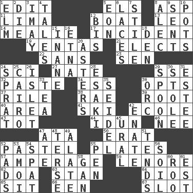 ACROSS 1. Prepare for publication 5. Raised railways 8. Viper 11. Pale green bean 12. Water vessel 13. Lion 14. Ear of corn 17. Happening 19. Gossips 21. Chooses 22. Without 23. Elected rep. 24. _-fi 27. Nathan's nickname 29. Compass dir. 32. Thick mixture 34. Double-curved letter 36. Elects 37. Cause heat under the collar 38. Actress Charlotte 39. Carrot, for example 40. Type of rug 41. What Jean-Claude Killy likes to do 42. Learning spot: Fr. 43. Small child 44. Goddess of spring and wife of Bragi 46. Born 47. "One Day ___ Time" 50. Part of Q.E.F. 52. Soft color 55. Food holders 57. Electrical Measurement 59. Poe poem 62. ___ good deed 63. Comedian Laurel of Laurel & Hardy 64. "Vaya con ____" 65. Be seated 66. Car or cant ending 67. Groove DOWN 1. Shade tree 2. Expire 3. "If ____ say so..." 4. Falsehoods 5. A really long time 6. Shoestrings 7. Vertical member of a panel or frame 8. Actor Baldwin 9. Transmitted 10. Plant holders 12. Again 15. Silly 16. Inactive volcano in Sicily 18. Lair 20. Michaelmas daisies 24. Small fatty European fish 25. Capital of Egypt 26. Small island 28. 1973 Nobel Price Winner (Physics) Leo 29. Soup utensil 30. Fur scarf 31. First name in cosmetics 33. Afternoon social gathering 35. A glass for beer 36. The grampus (Milton) 42. Maternal 45. Mountain range 47. Had dinner 48. Laconic 49. Having winglike extensions 51. Watches over 52. Groovy apts. 53. Mine, in Marseilles 54. Petty quarrel 55. Animal enclosure 56. The visible part of the earth's surface 58. Separate the seeds from cotton 60. Friend of Pooh 61. Eastern Standard Time (abbr.)
