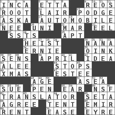 ACROSS 1. South American Indian 5. Singer James 9. Vintage cars 13. Carrot, for example 14. Den 15. Puddle 16. "____ silly question..." 17. Form of transportation 19. Born 20. Single; one (prefix) 21. Impair 22. Snakelike fish 23. Fast planes 25. Fitting 26. Robbery 30. Grandmother 34. Bert's buddy 35. Pig sound 36. Elected reps. 39. Showery time 42. The content of cognition 43. Toward shelter 44. Ceases 46. Dec. holiday 47. First name in cosmetics 48. Grow older 51. At sea 54. Institute legal proceedings 57. Animal enclosure 58. Hearing organ 60. Overdraft (abbr.) 62. Interpreter 65. Stalk of a moss capsule 66. Match 67. Portable shelter 68. Arab leader 69. Monthly bill 70. Comfort 71. Jane of fiction DOWN 1. SW Asia republic 2. Olfactory organs 3. Popular sodas 4. _ moment's notice (2 wds.) 5. Liveliness 6. "Change" in Tahitian 7. Teat (slang) 8. Scent 9. Director Reiner 10. Singer Brickell 11. Stare at amorously 12. Stitch closed the eyes of (a falcon) 15. Left side of a ship or aircraft 18. Atlas unit 20. One who uses or employs something 24. College papers 27. _ tizzy (2 wds.) 28. Small drink 29. Laconic 30. Annoying sounds 31. Help 32. Compass dir. 33. Alias (abbr.) 36. Saxophone 37. Shade tree 38. Teachers' org. 40. ___ a Wonderful Life 41. Car dealer's back yard 45. Lightbulb-shaped fruit 48. Domed church section 49. Set 50. Related on the mother's side 52. Foe 53. Moving about 54. Play the lead 55. Goad 56. Merit 58. Immeasurably long periods of time 59. Johnson of "Laugh-In" 61. Conductor's collection 63. Fish or hair follower 64. Beverage made from leaves 65. Observe