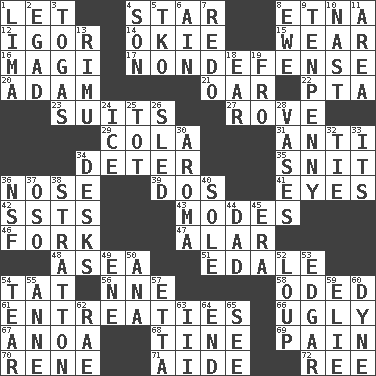 ACROSS 1. Allow 4. Play the lead 8. Inactive volcano in Sicily 12. Composer Stravinsky 14. Migrant worker of the '30s 15. Erode 16. Wise men 17. Unrelated to defense, as in spending 20. First man 21. Boat paddle 22. Parent Teacher Assoc. 23. Sets or collections 27. Be footloose 29. Root beer relative 31. Opposed to 34. Prevent from occurring 35. In a ____ (agitated or irritated) 36. Characteristic smell of wine 39. Two (Sp.) 41. Sight organs 42. Fast planes 43. Methods 46. Tined utensil 47. Having or resembling wings 48. At sea 51. Peak District village in England 54. Make lace 56. Compass dir. 58. Wrote a lyric poem 61. Pleas 66. Unsightly 67. Small Philippine buffalo 68. Prong on a fork 69. Ache 70. French philosopher Descartes 71. Helper 72. Portuguese money of account (variant) DOWN 1. Pale green bean 2. Mild oath 3. Ancient Roman robes 4. Manchild 5. Ring climax 6. The 18th letter of the Arabic alphabet 7. Make new 8. She-sheep 9. 3-inch nail 10. Political cartoonist Thomas 11. Type of rug 13. Tall New Zealand timber tree 18. Hearing organ 19. From 24. Frozen water 25. Small child 26. Downhill vehicle 28. Flower holders 30. Odor 32. Neckwear 33. ___ a Wonderful Life 34. Writing tables 36. Overdraft (abbr.) 37. Bear (Spanish) 38. Ski resort town in Vermont 40. Flatfish 44. June honoree 45. Epoch 49. Compass dir. 50. Santa ___, CA 52. Central Nebraska county 53. _ Allan Poe 54. Separate forcefully 55. Singer Murray 57. Singer James 59. Writer Wiesel 60. Unit of force 62. Actress Charlotte 63. One more than two 64. Conclude 65. Perceive with the eye