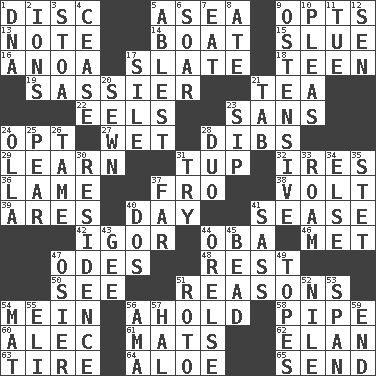 ACROSS 1. Flat circle 5. Toward the sea 9. Chooses 13. Make mention of 14. Water vessel 15. Turn sharply 16. Small Philippine buffalo 17. Schedule 18. Adolescent 19. More lively and spirited 21. Afternoon social gathering 22. Snakelike fish 23. Without 24. Elect 27. Dripping 28. Claim 29. Memorize 31. Uncastrated adult male sheep 32. Angers 36. Unable to walk 37. From 38. Electrical Unit 39. Ancient Greek god of war 40. 24 hours 41. Gospel singer Marvin 42. Russian composer Stravinsky 44. Chief or king in Benin or Nigeria 46. Was introduced to 47. Lyric poems 48. Remainder 50. Perceive with the eye 51. Thinks logically 54. Count _ (2 wds.) 56. Hold, grip (Informal) 58. Corncob 60. Actor Baldwin 61. Floor coverings 62. Liveliness 63. Hoop that covers a wheel 64. _ vera 65. Transmit DOWN 1. Heredity factor (abbr.) 2. Charged atoms 3. Portico 4. Desist 5. Most capable 6. Fly high 7. Ingest 8. Had dinner 9. Clearly or manifestly demonstrative 10. Entreaties 11. Third day of the wk. 12. Elected rep. 17. Filth; sediment 20. Stitched 21. Keyboard key 23. Small drink 24. Spanish pot 25. Lightbulb-shaped fruit 26. Not wild 28. Superhero pair 30. Dwelling 31. Attempt to accomplish something 33. Wander 34. Otherwise 35. Proofreading order 37. At a great distance 40. Two (Sp.) 41. Backtalk 43. Unit of force equal to gravity 44. Threatening words 45. Necklace unit 47. Flexible twig of a willow tree 49. Drinks excessively 51. Printing process, for short 52. "Death on the ____" 53. Connect, as a bridge 54. Floor covering 55. Connecticut Ivy Leaguer 56. Nursemaid (var.) 57. Actor Linden 59. Conclusion