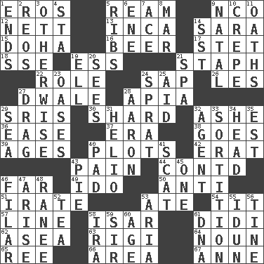ACROSS 1. Greek god of love 5. 480, 500 or 516 sheets of paper 9. Non-commissioned officer (abbr.) 12. Remaining after all deductions 13. South American Indian 14. "Two Mules for Sister ____" 15. Capital of the state of Qatar 16. Fermented drink made from hops 17. Proofreading order 18. Compass dir. 19. Curvy letter 21. Staphylococcus 22. Hero or heavy, e.g. 24. Plant excrement 26. French article 27. A sleeping potion; an opiate (poet.) 28. Capital of Western Samoa 29. Indian titles of respect 30. Pottery fragment 32. American tennis player Robert 36. Comfort 37. Epoch 38. Leaves 39. Ripens 40. Secret plans 42. Part of Q.E.F. 43. Ache 44. Continued (abbr.) 46. Distant 49. Wedding promise 50. Opposed to 51. Feeling or showing extreme anger 53. Had dinner 54. Teat (slang) 57. Actor's bit 58. Austrian river, tributary to the Danube 61. "You Light Up My Life" star Conn 62. At sea 63. Swiss mountan, "Queen of the Mountains" 64. Part of speech 65. To separate or throw off 66. Length times width 67. Queen of England 1702-14 DOWN 1. Extremities 2. Vintage cars 3. Else 4. R.R. building 5. Teases 6. Compass dir. 7. Adept person 8. Third mo. 9. Brizilian seaport 10. Streamer paper 11. Expletives 14. Fast jet (abbr.) 19. Pipe bend 20. Observes 21. Health resort 23. Fertile tracts in a desert 24. Small fatty European fish 25. Help 27. To be drawn or hauled along 28. Composer Copland 29. Ocean 31. Sun: prefix 32. Representative 33. Determination 34. Froth on beer 35. Eastern Standard Time (abbr.) 40. Groovy apt. 41. Get outta here! 43. Sliced dessert 45. Single 46. Of or pertaining to a thread or threads 47. Ascend 48. The wife of a rajah (variant) 52. Beverage made from leaves 53. Operatic vocal solo 55. Goddess of spring and wife of Bragi 56. Prong on a fork 58. Retirement account (abbr.) 59. Title for a knight 60. Ripen 61. Heredity factor (abbr.)